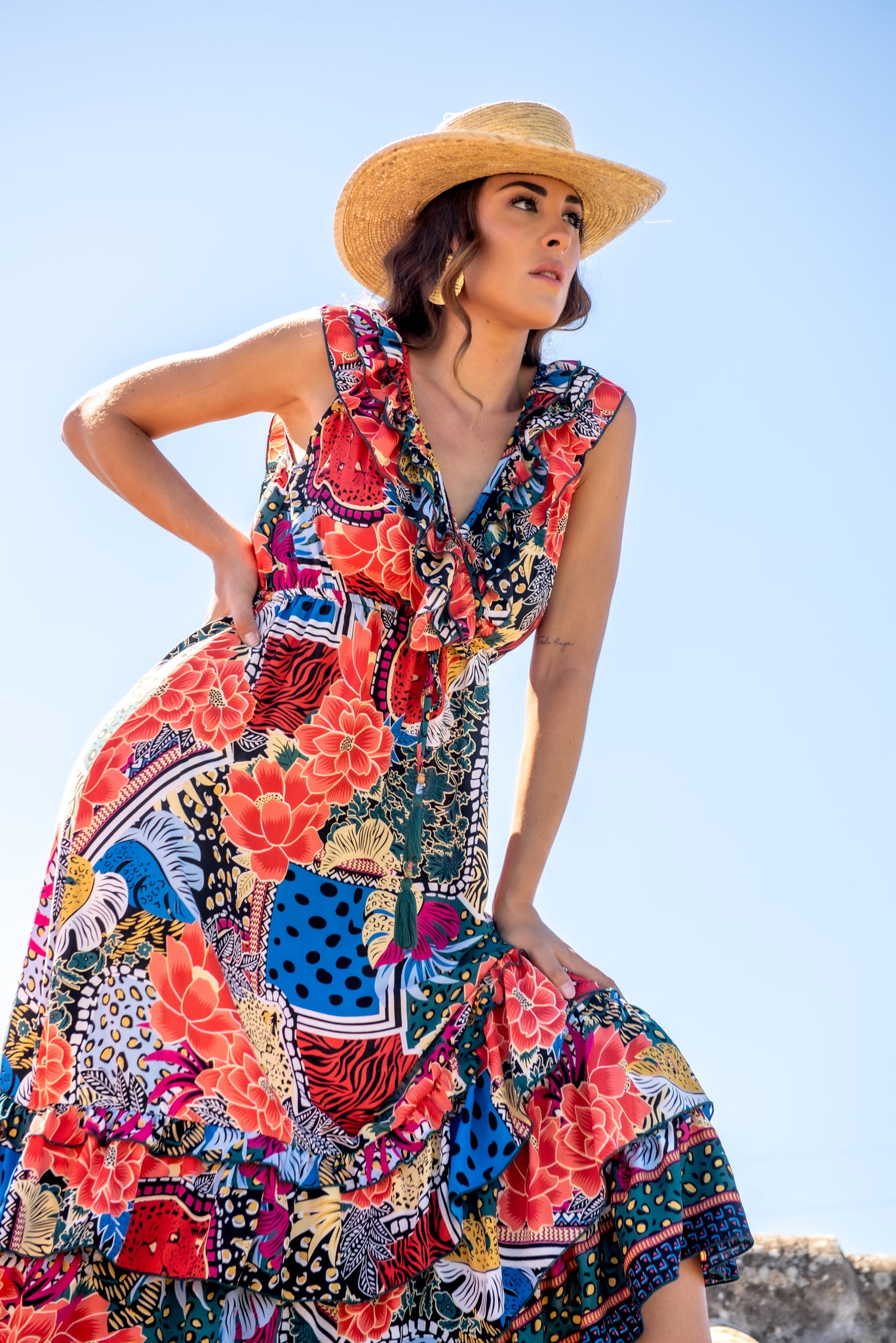 Vestido sarmiento de polysilk fondo negro y estampado de grandes flores y patwork naranjas escote y espalda de pico con volantes en escote y espalda hasta cintura. Sin mangas y detalle de cordón con borlones al tono ajustable en la cintura.