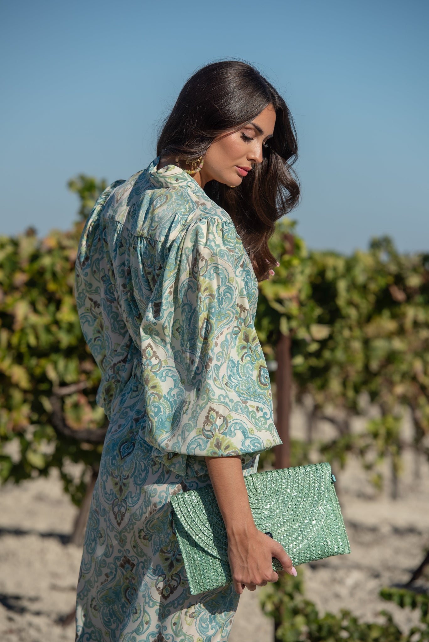 Vestido albariza polysilk con cachemira en tonos verdes y azules pastel manga larga abullonada con puño y escote cruzado.