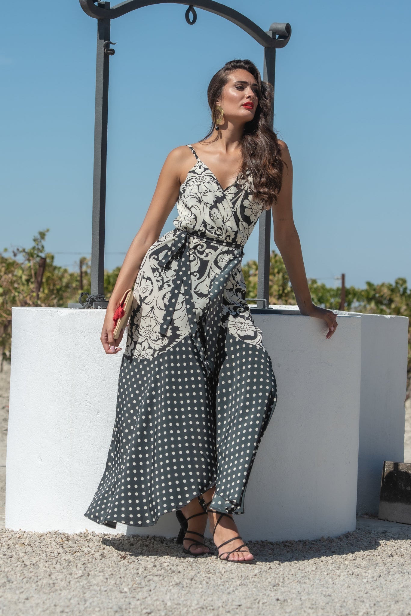 Vestido almijar de polysilk con motivos ornamentales bicolor en beige y negro cruzado de tirantas y volante capa.