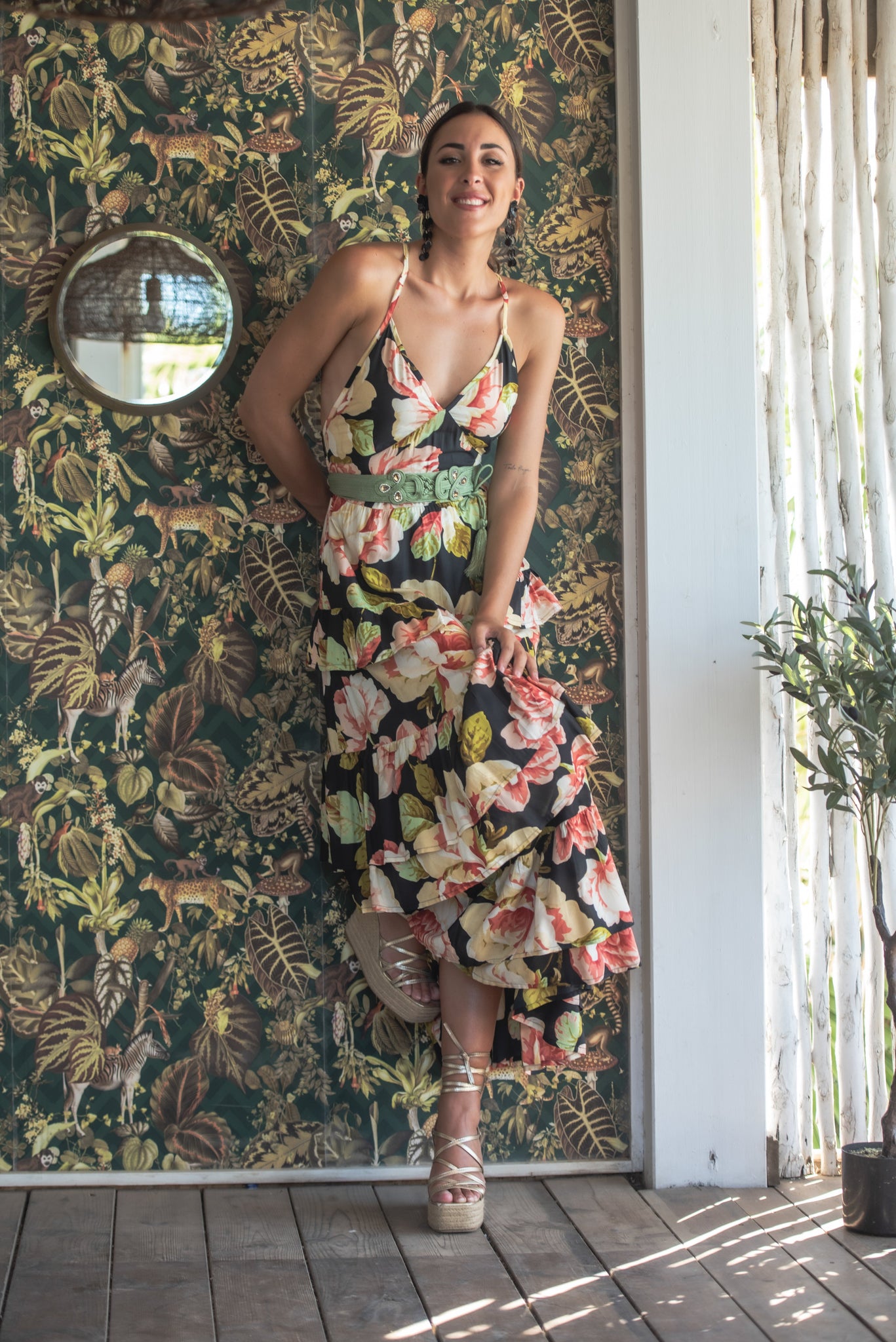 Vestido elba volante largo de tirantas en viscosa estampado de fondo negro con grandes rosas en tonos maquillaje y coral con volantes.