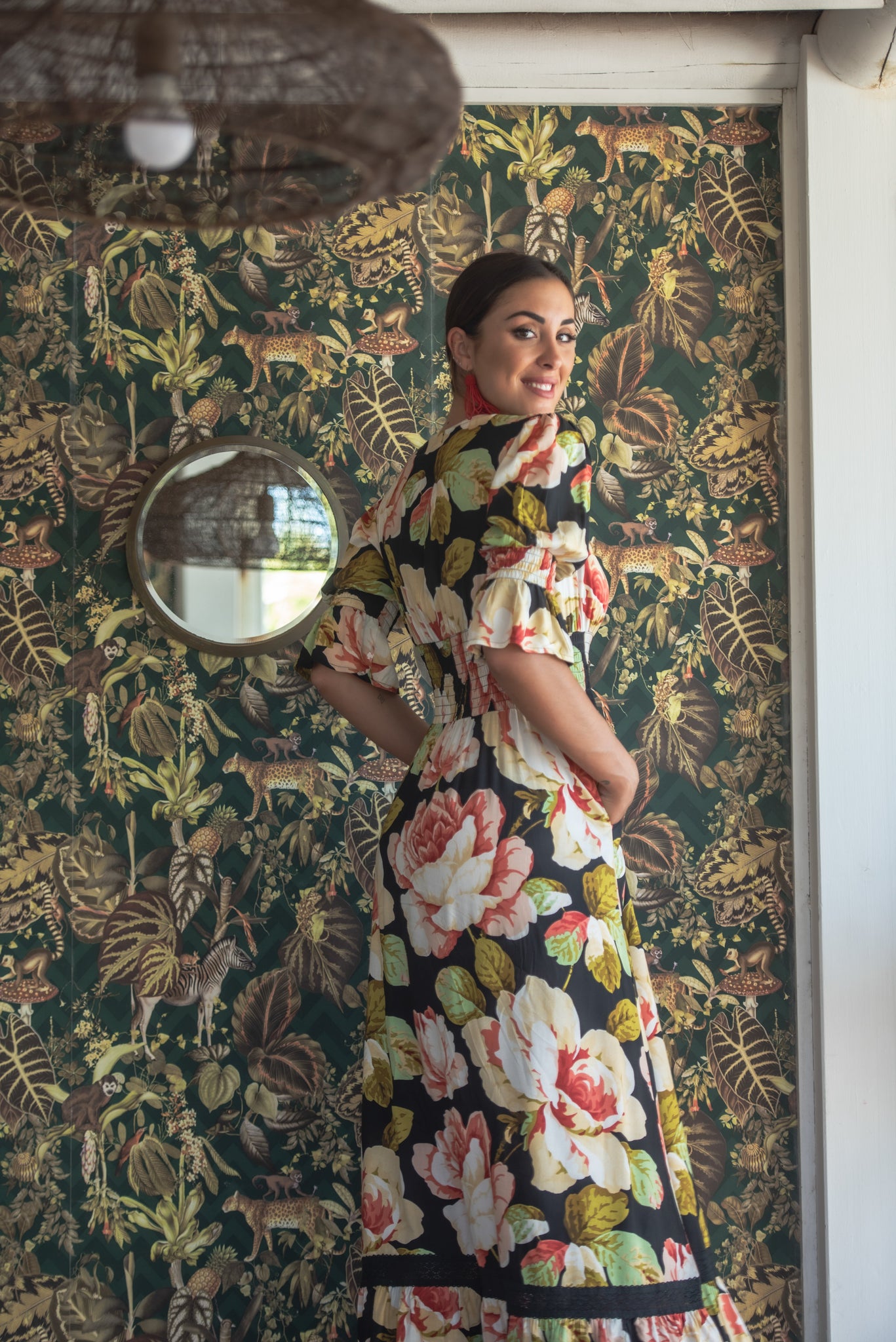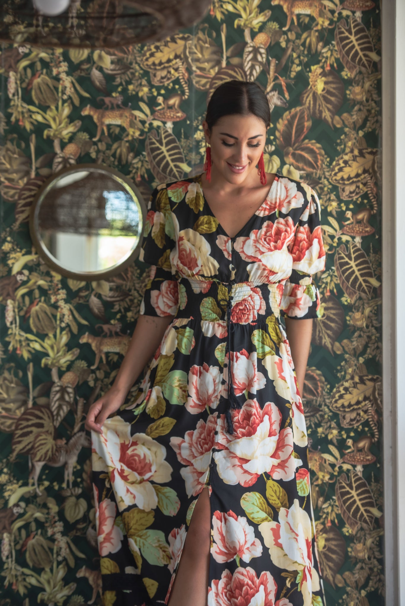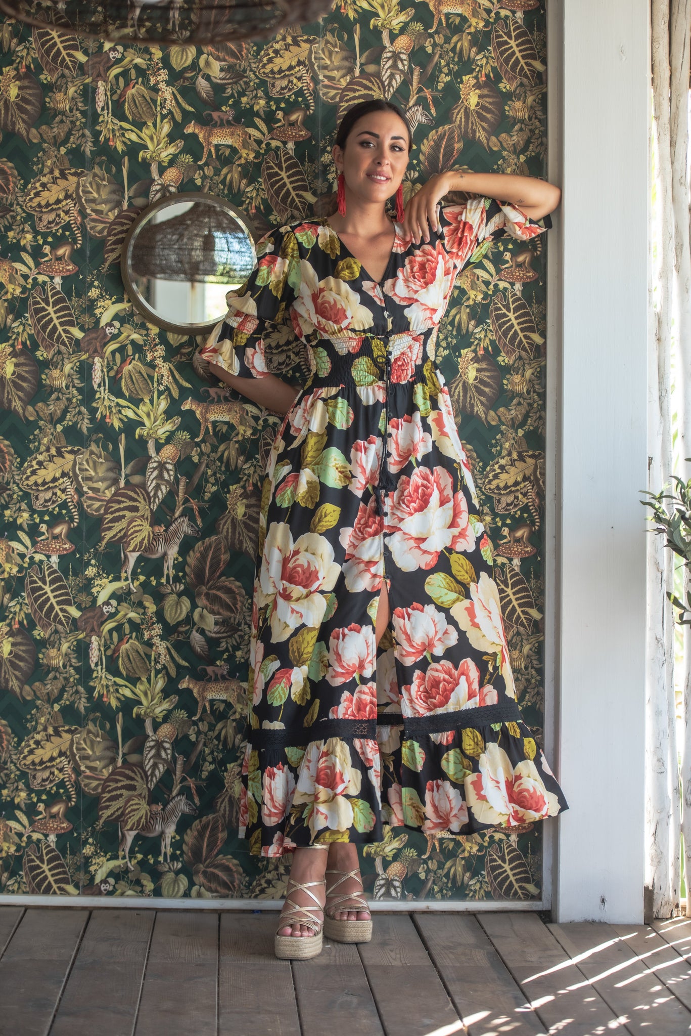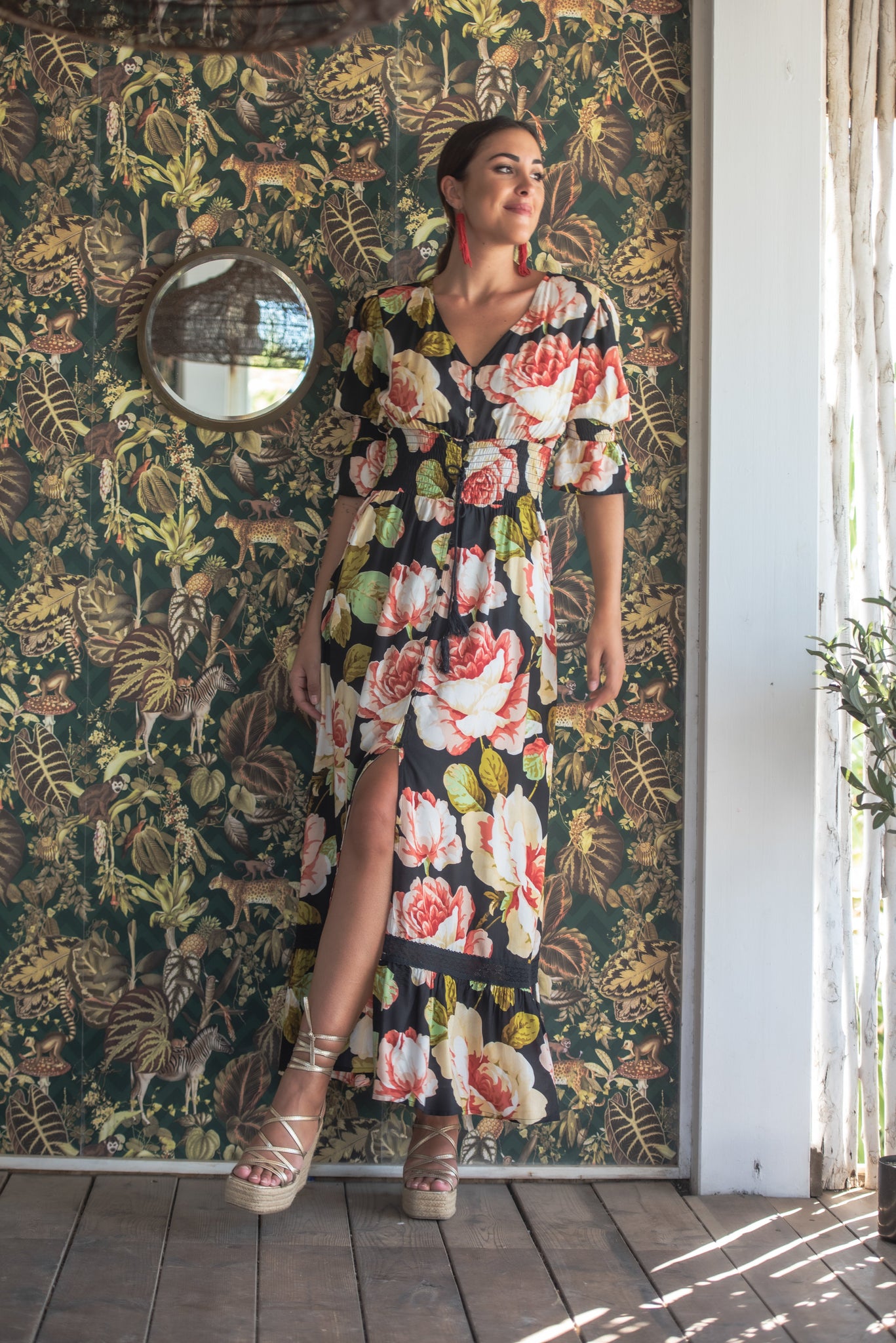 Vestido elba camisero largo de viscosa estampado de fondo negro con grandes rosas en tonos maquillaje y coral con apliques negro de pasamanería.