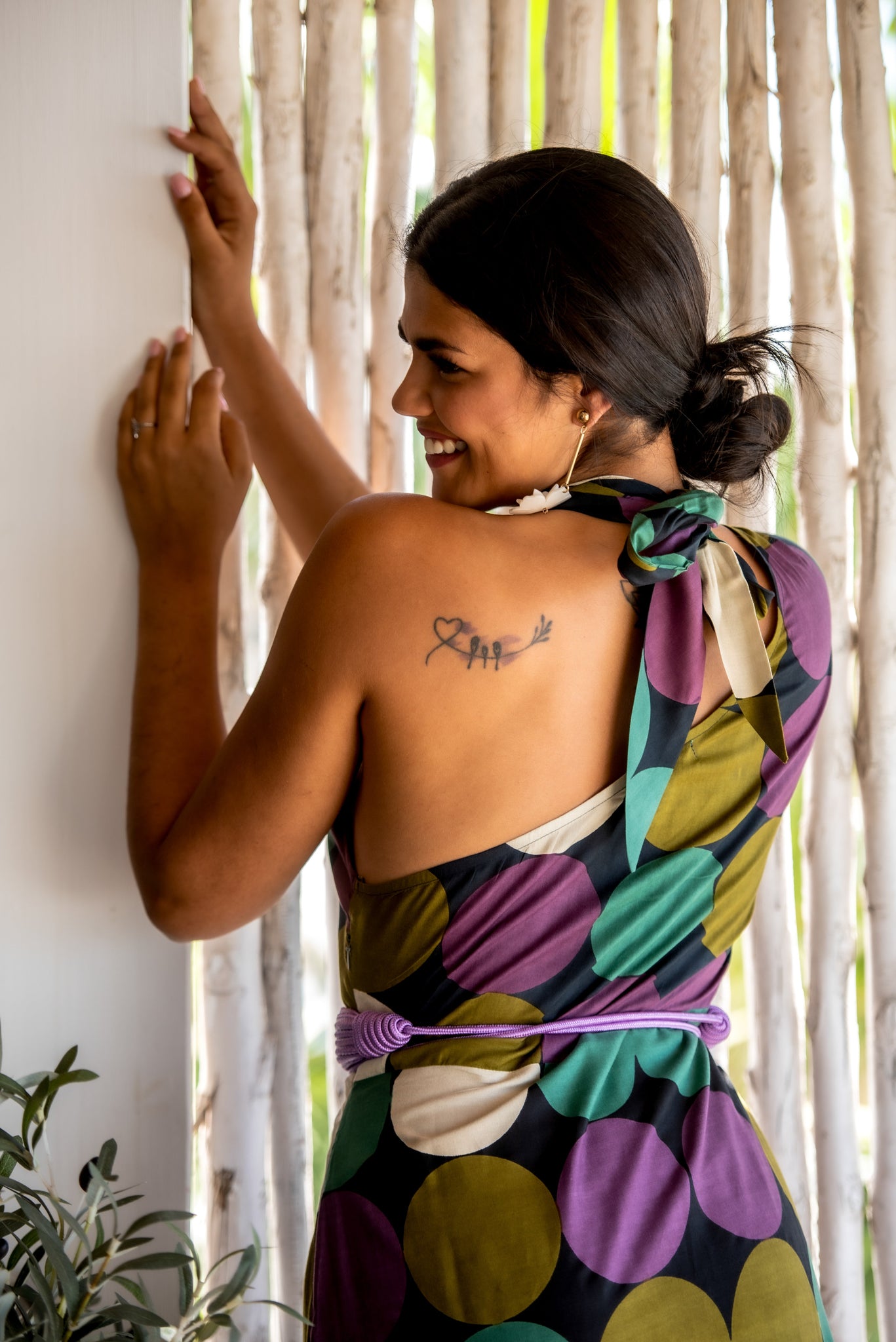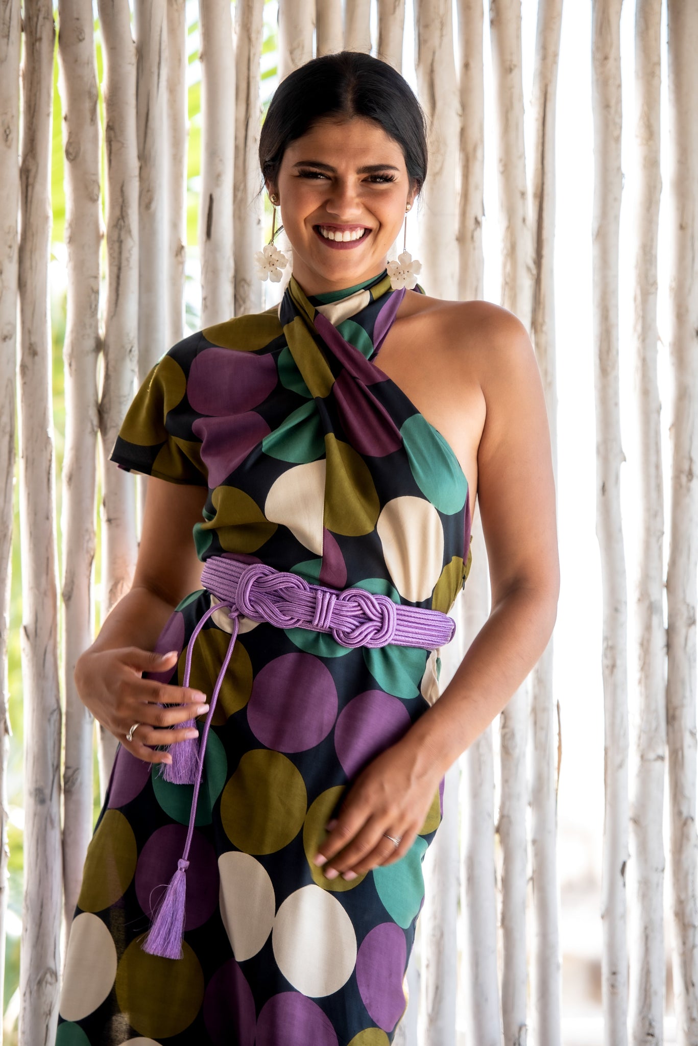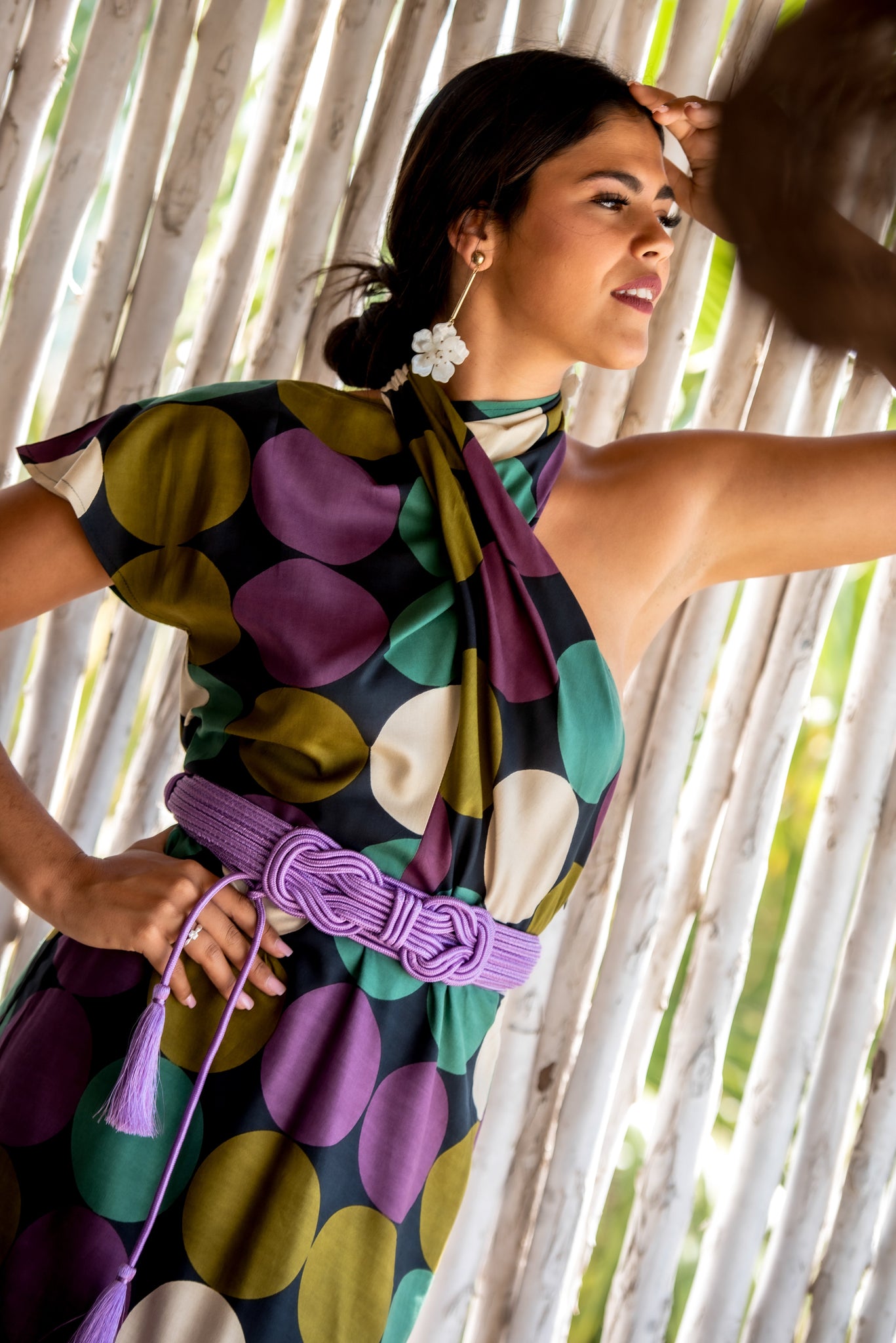 Vestido cerdeña cuello anudado pañuelo en viscosa estampado de lunares grandes en verde - morados y esmeralda.