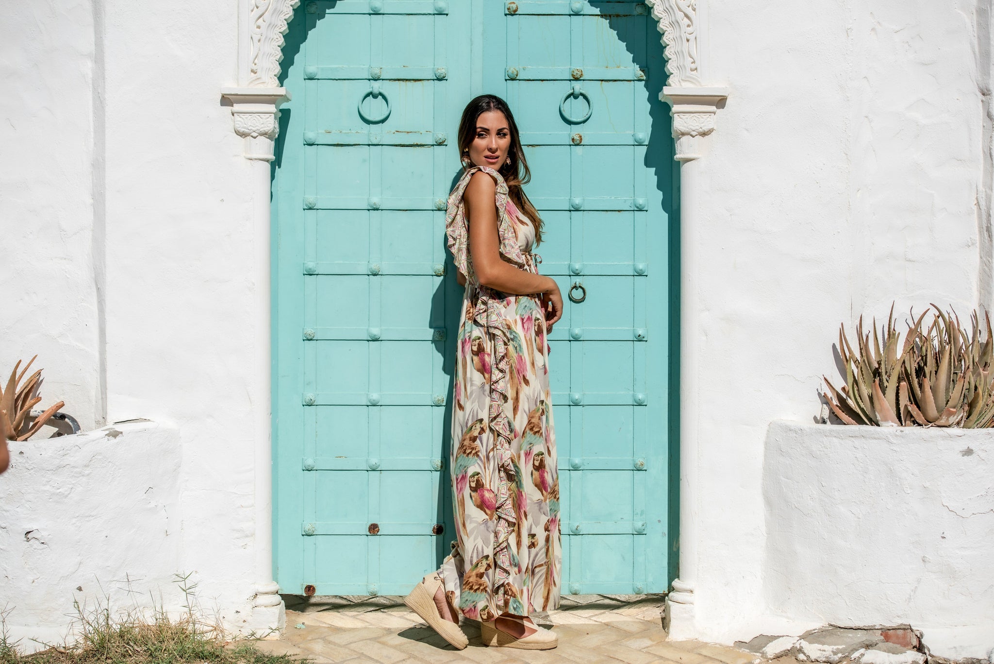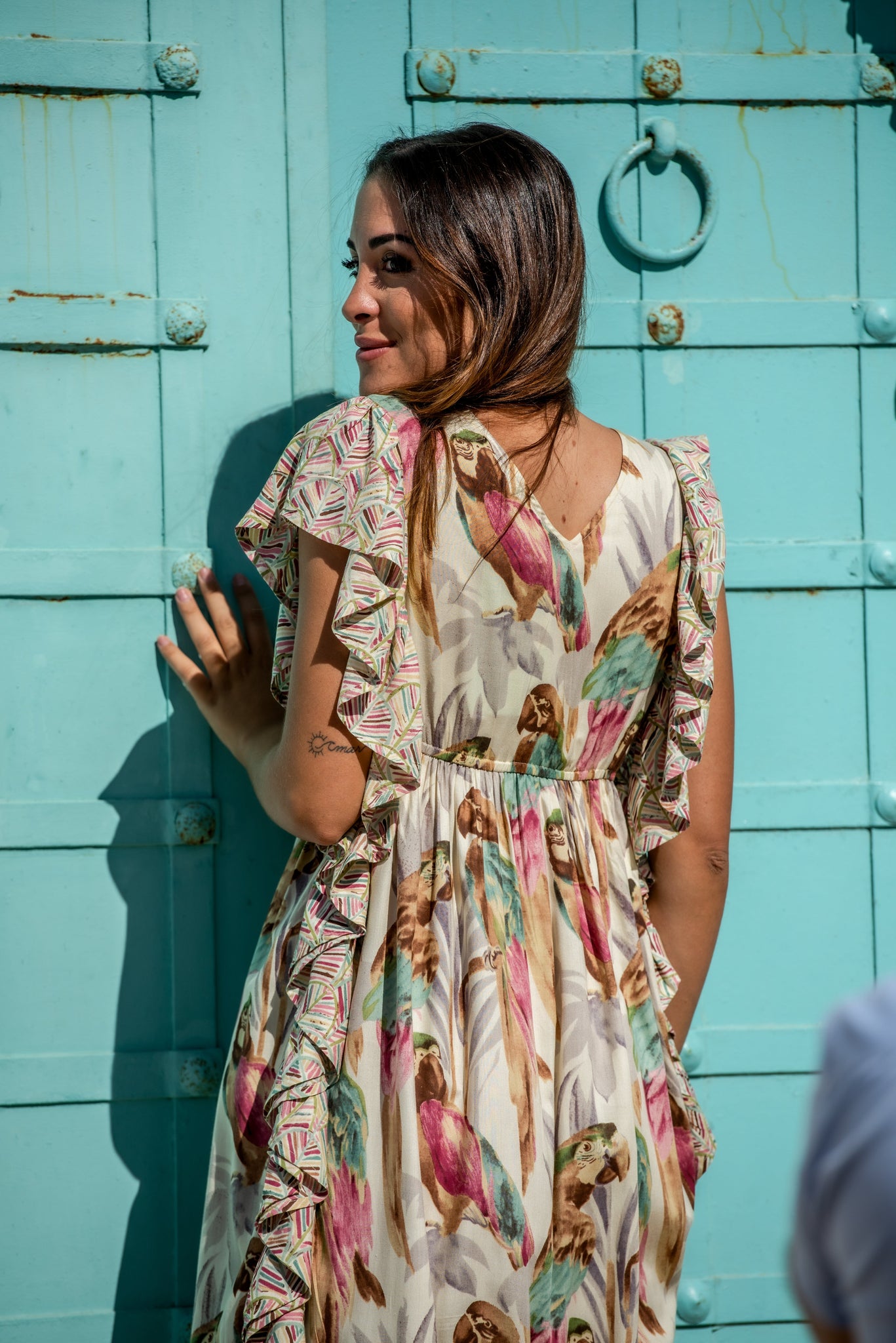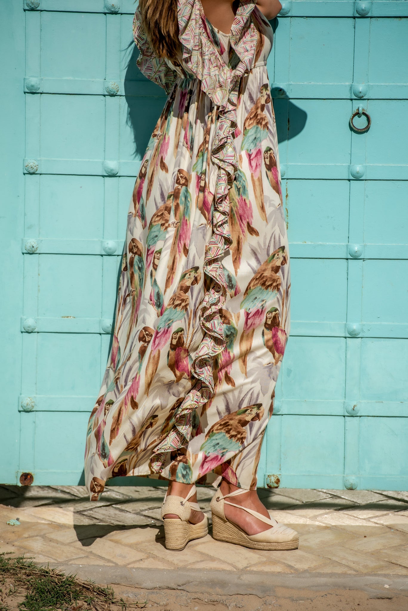 Vestido guacamayo en viscosa túnica estampado crudo con guacamayos en tonos pastel y combinado con estampado haciendo hojas en volantes laterales.
