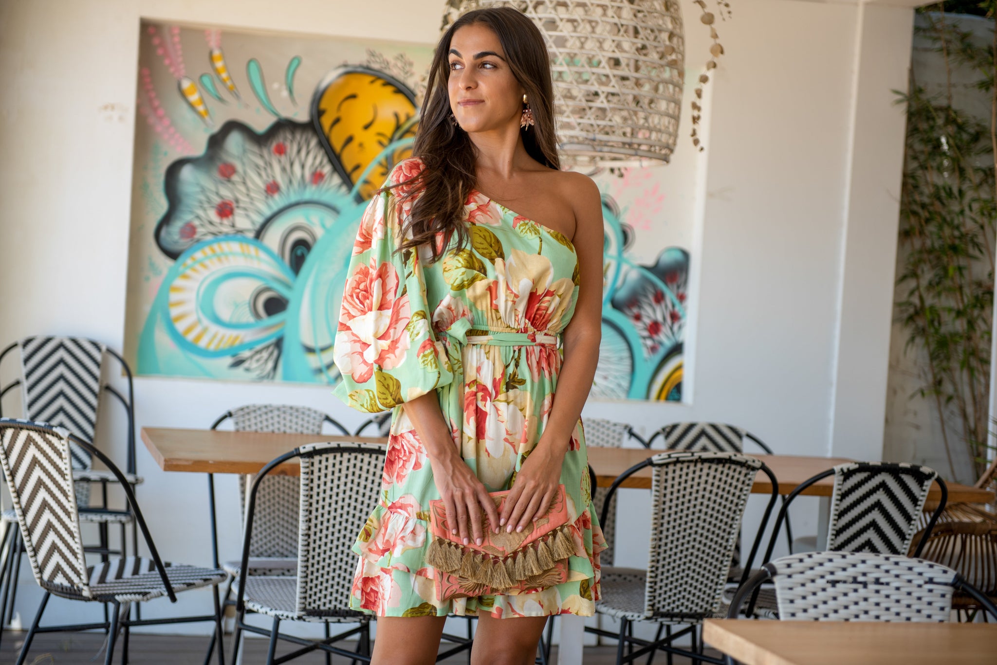 Vestido Formentera asimétrico corto en viscosa estampado verde agua con grandes rosas color maquillaje.