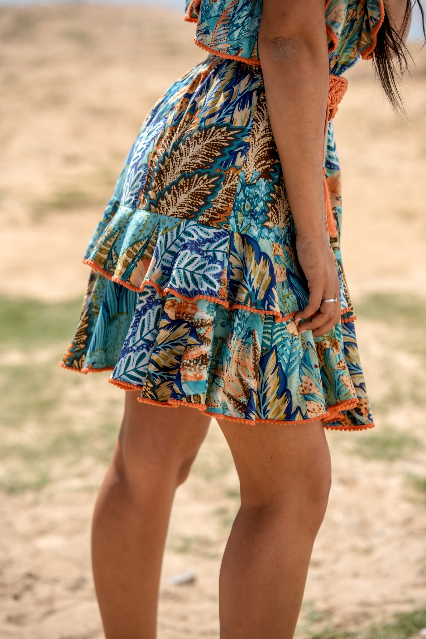 Vestido Menorca corto en viscosa estampado de tonos turquesas y azulinas con hojas naranjas y tostadas largo sin manga.