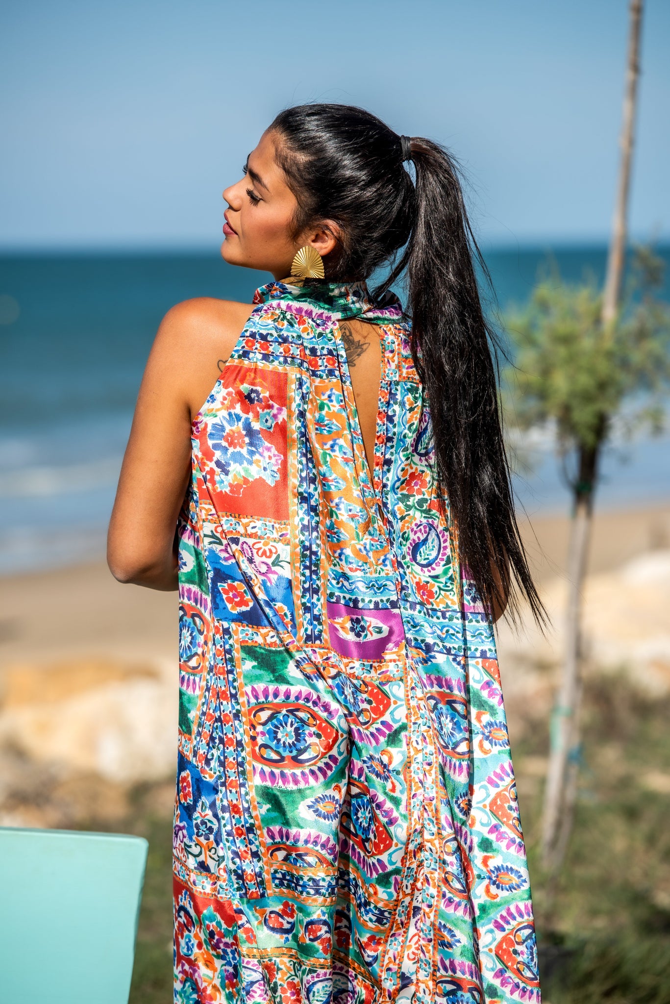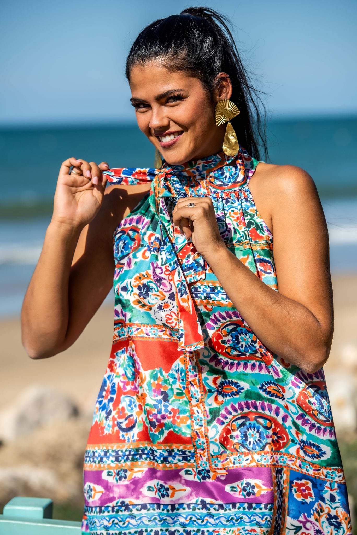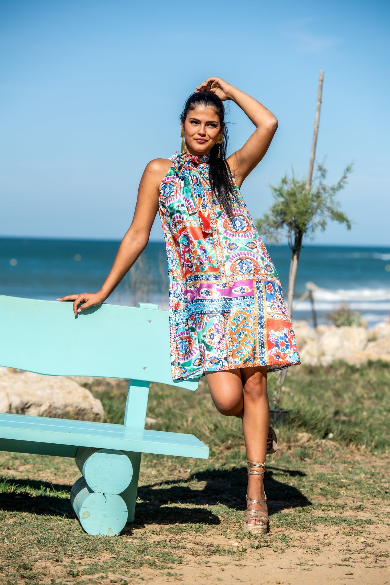 Vestido atenas yeye de polisilk con estampado de grecas asimétricas en tonos corales corto y cuello cisne anudado al cuello.