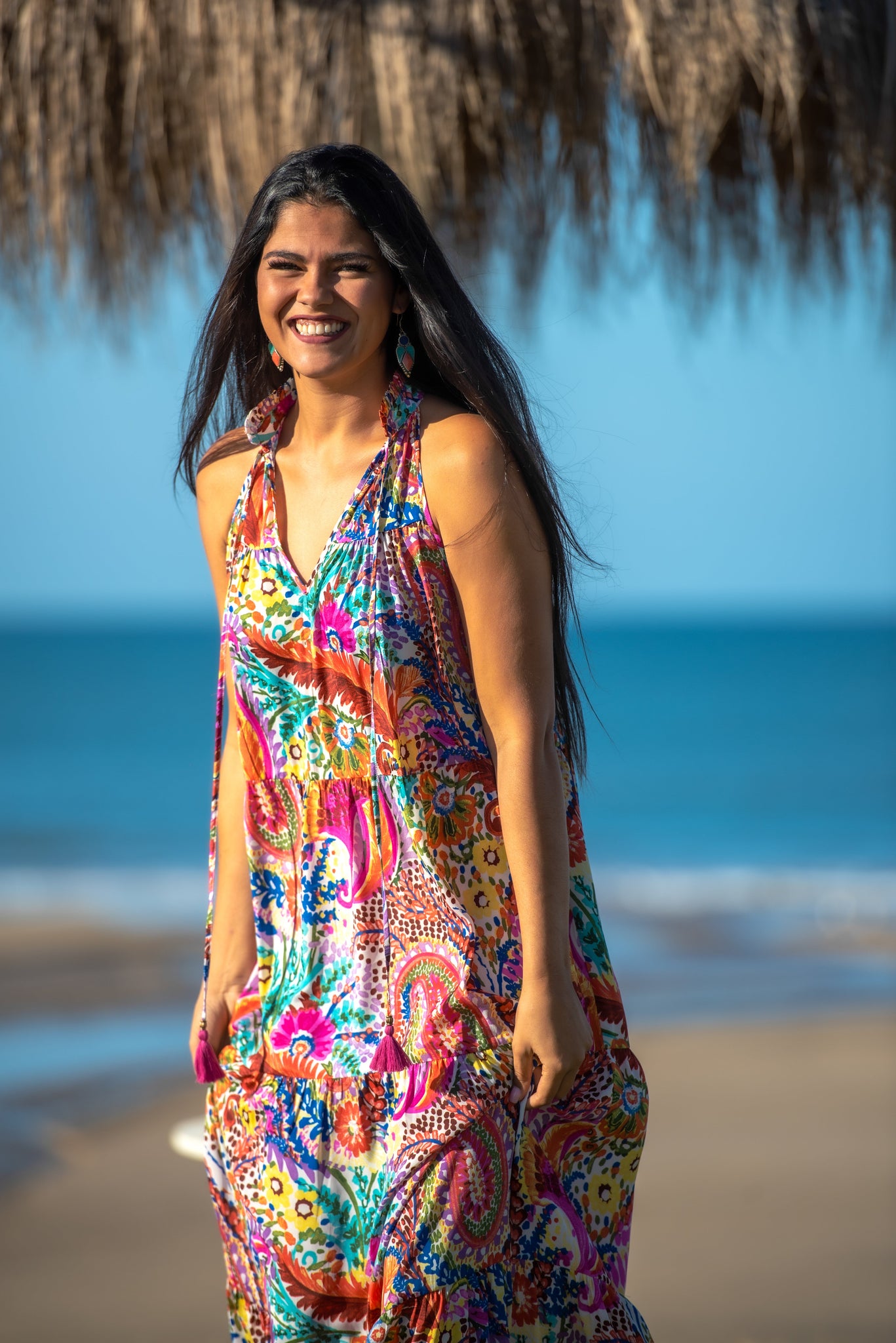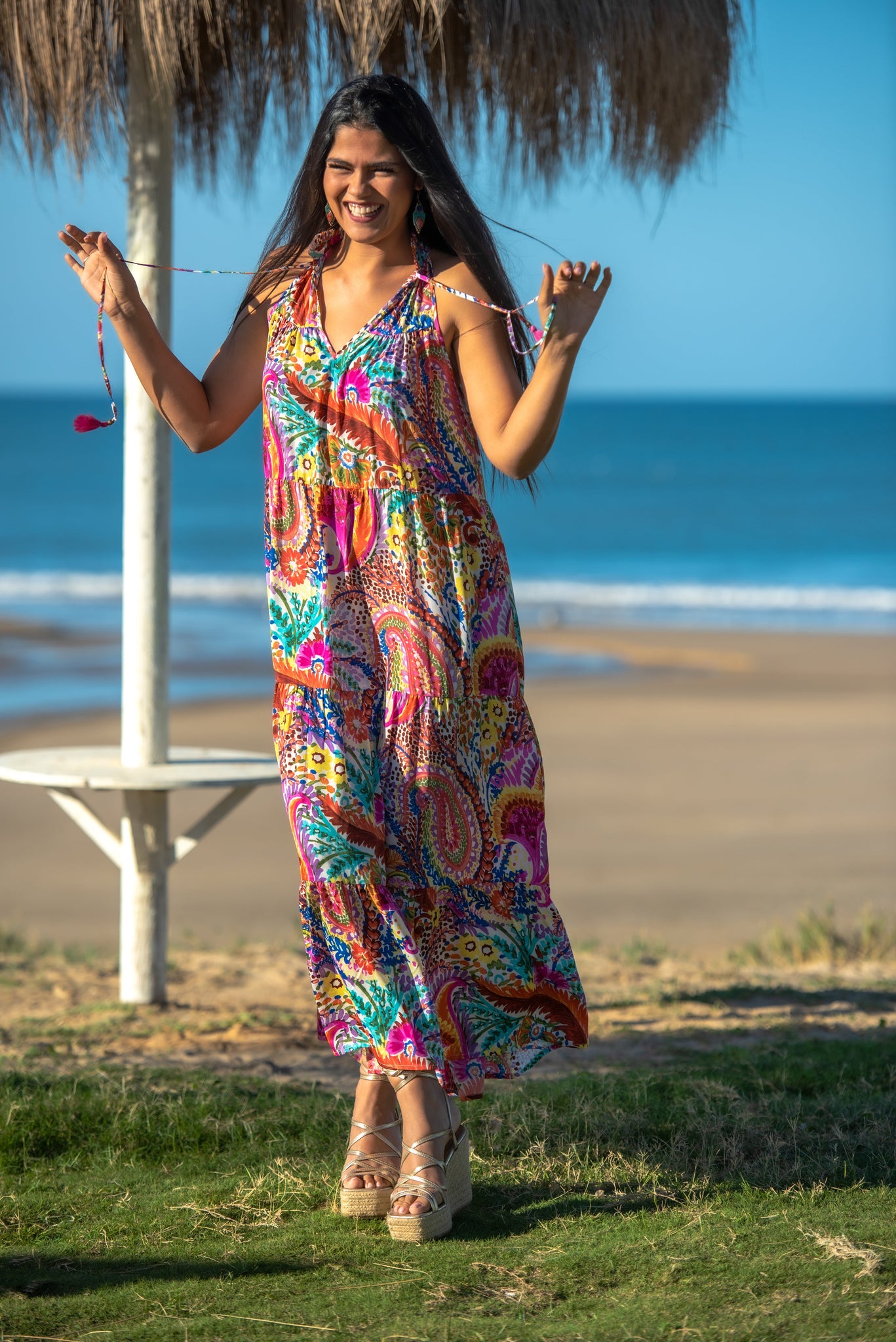 Vestido chíos polysilk fondo blanco cachemira naranjas - verde agua y mostazas cuello halter alto con volante y anudado al cuello con borlones.