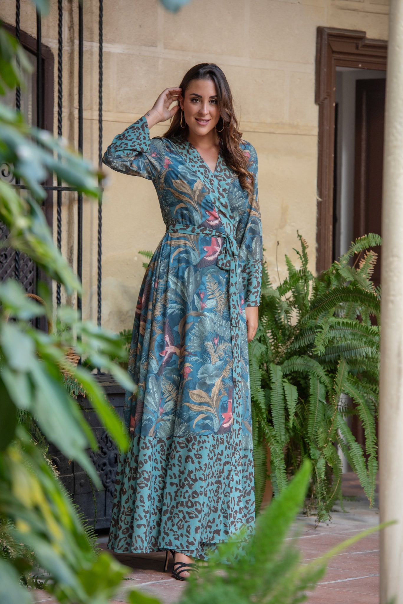 Vestido magalí cruzado gasa de estampado botánico verde junco con pájaro coral combinado con animal print de guepardo turquesa.