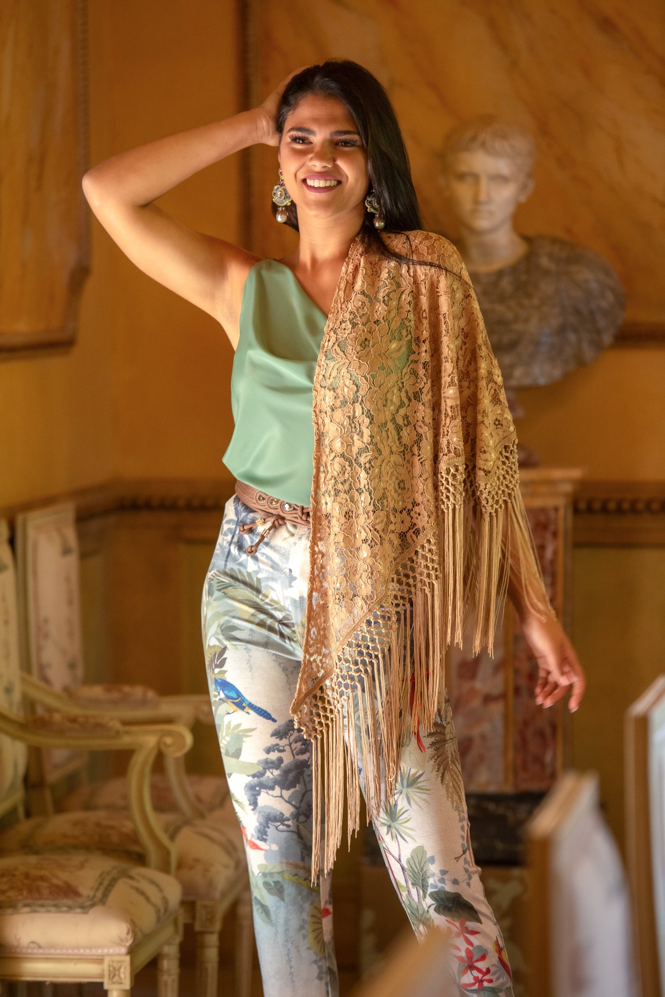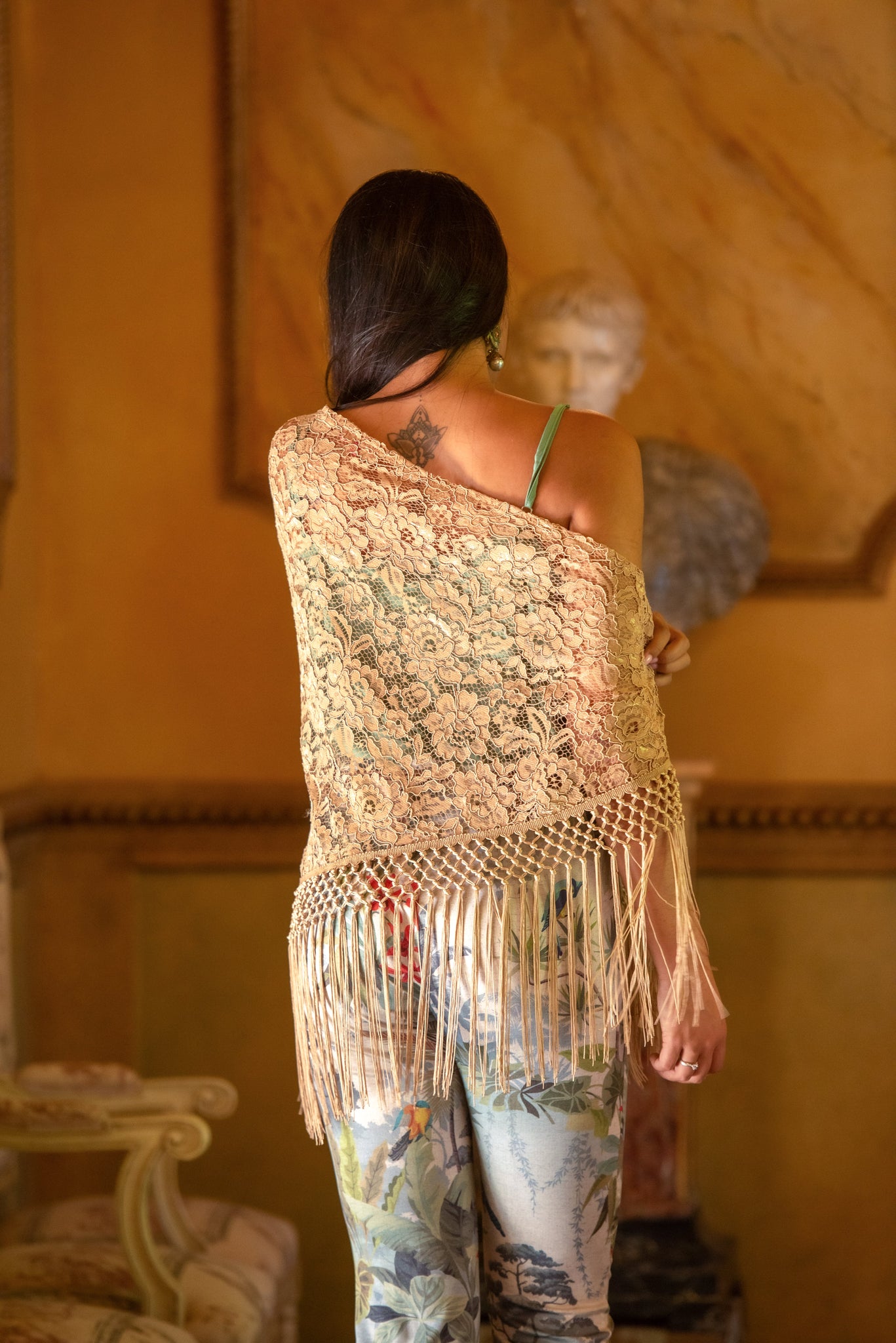 Mantón de encaje en pico color beige con flecos enrejados al tono.