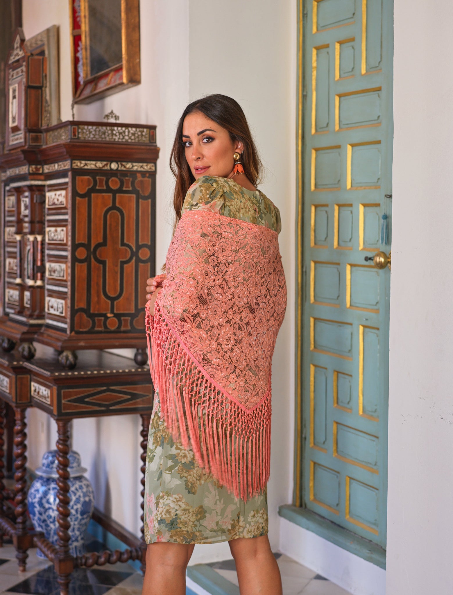 Mantón de encaje en pico color coral con flecos enrejados al tono.