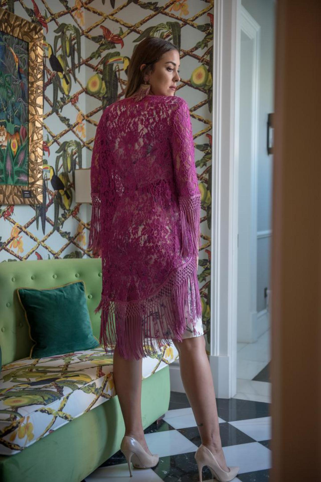 Chaqueta de encaje buganvilla con media manga y flecos al tono en el bajo de la manga y de la chaqueta