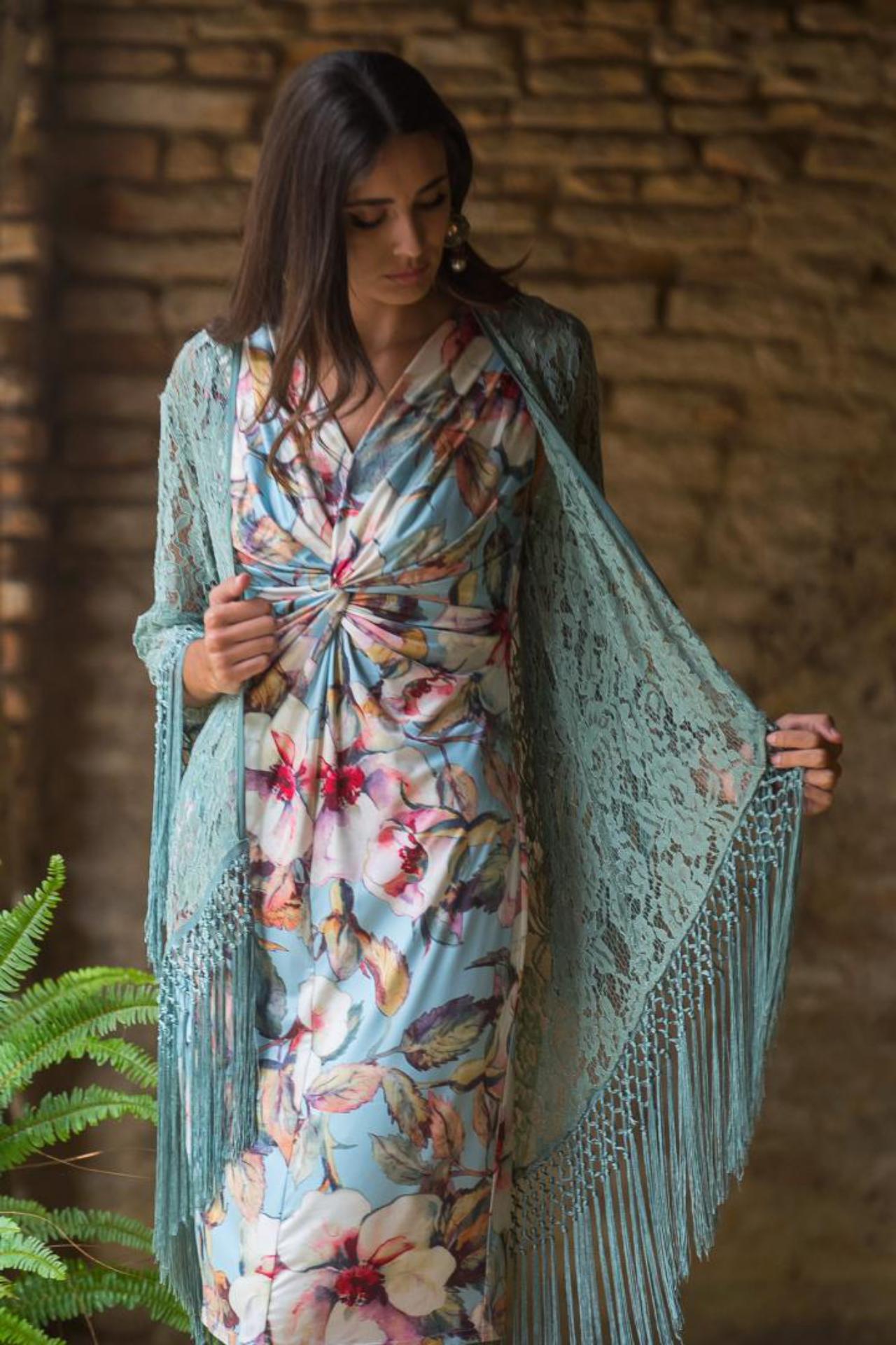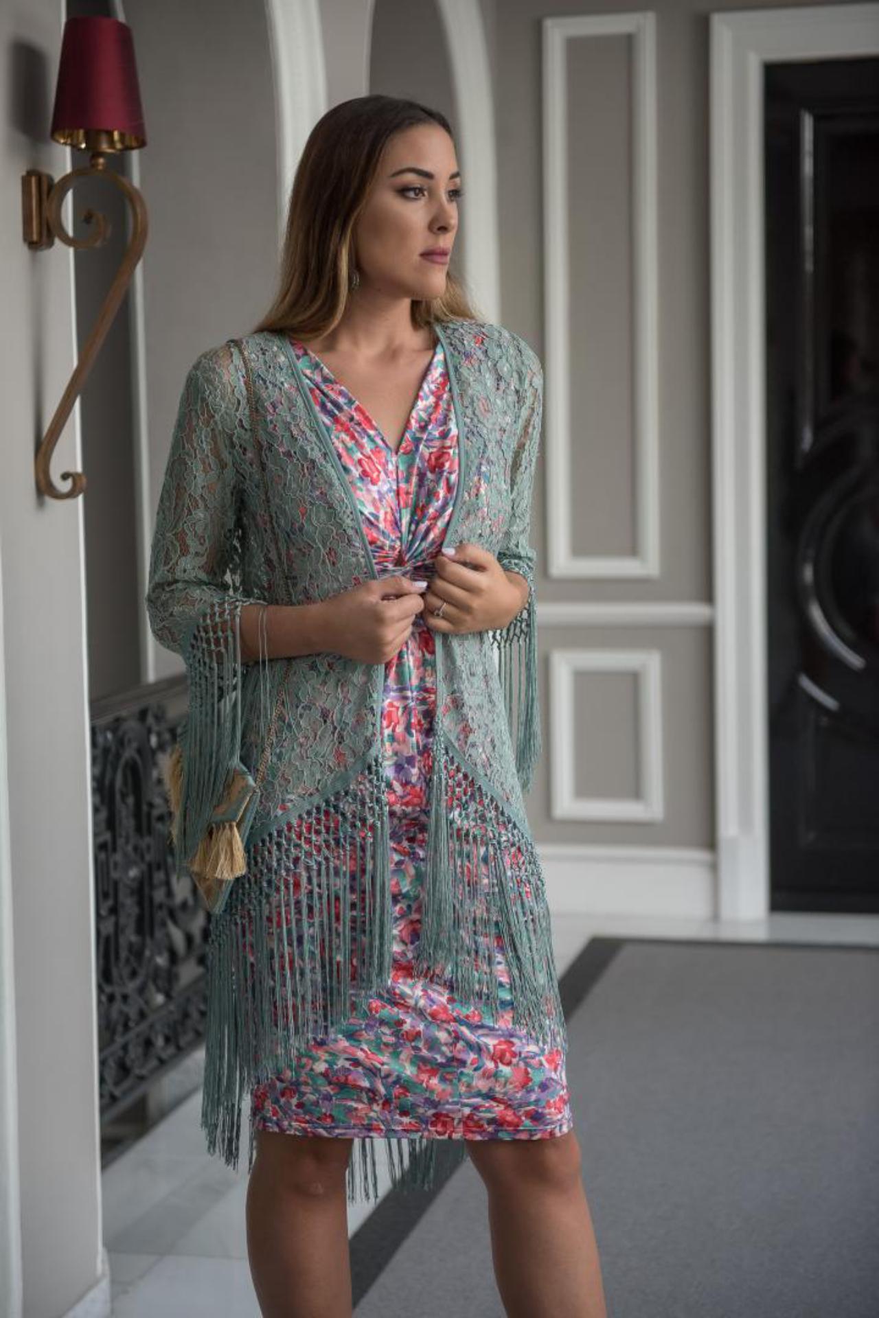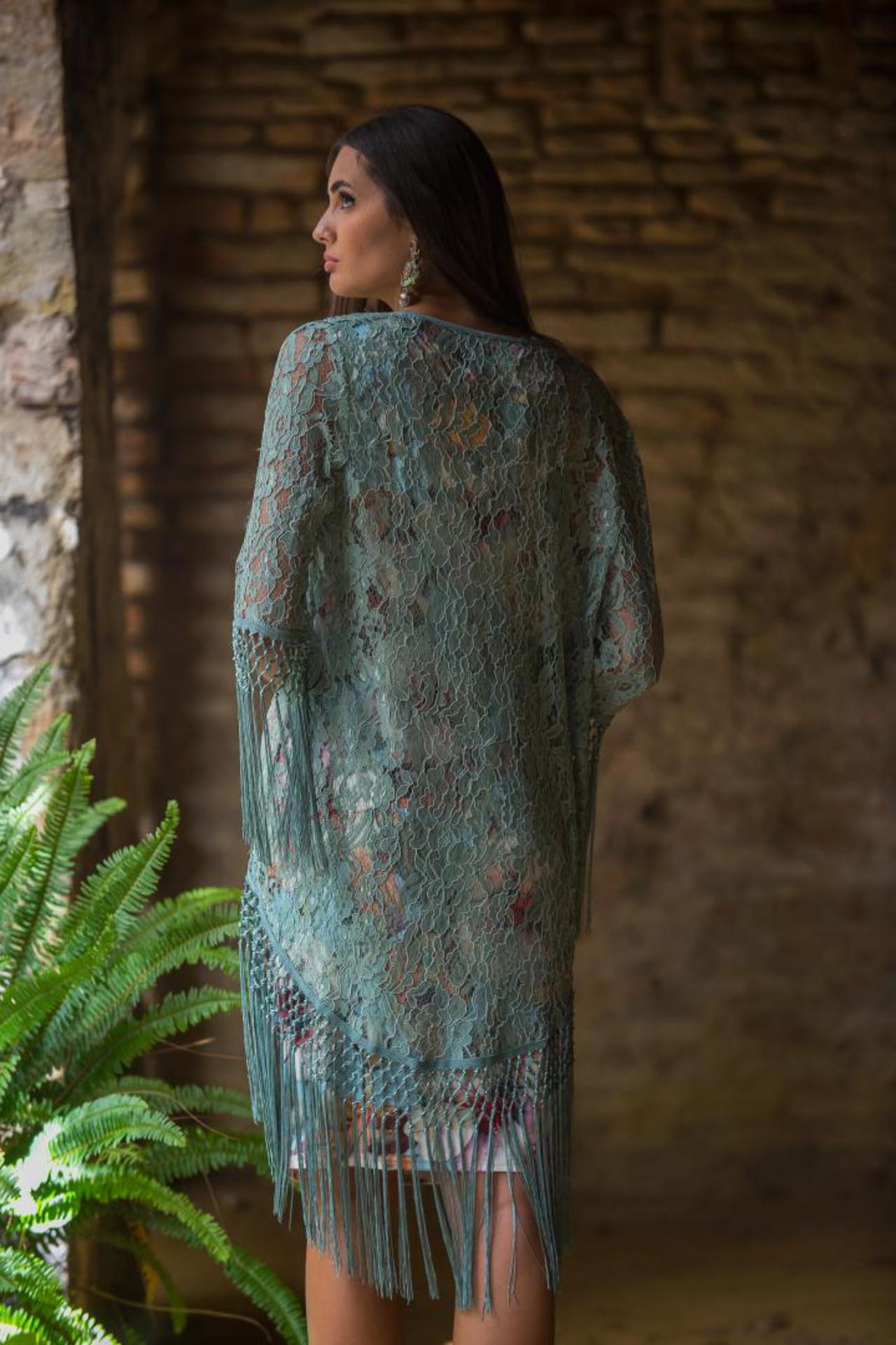 Chaqueta de encaje verde agua con media manga y flecos al tono en el bajo de la manga y de la chaqueta