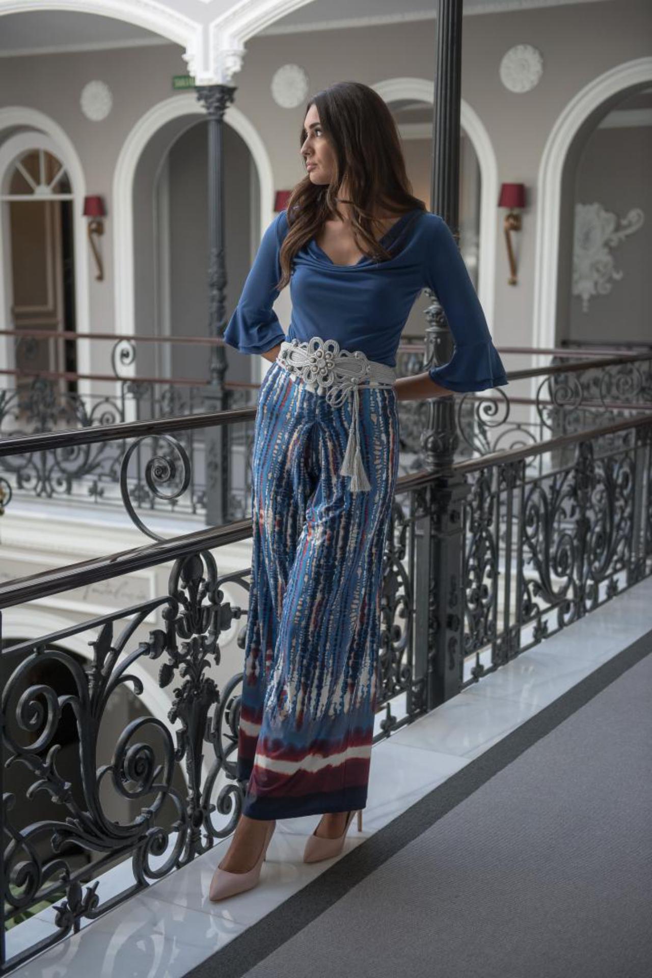 Top en punto de seda liso en color azul de media manga con doble volante capa y cuello drapeado columpio