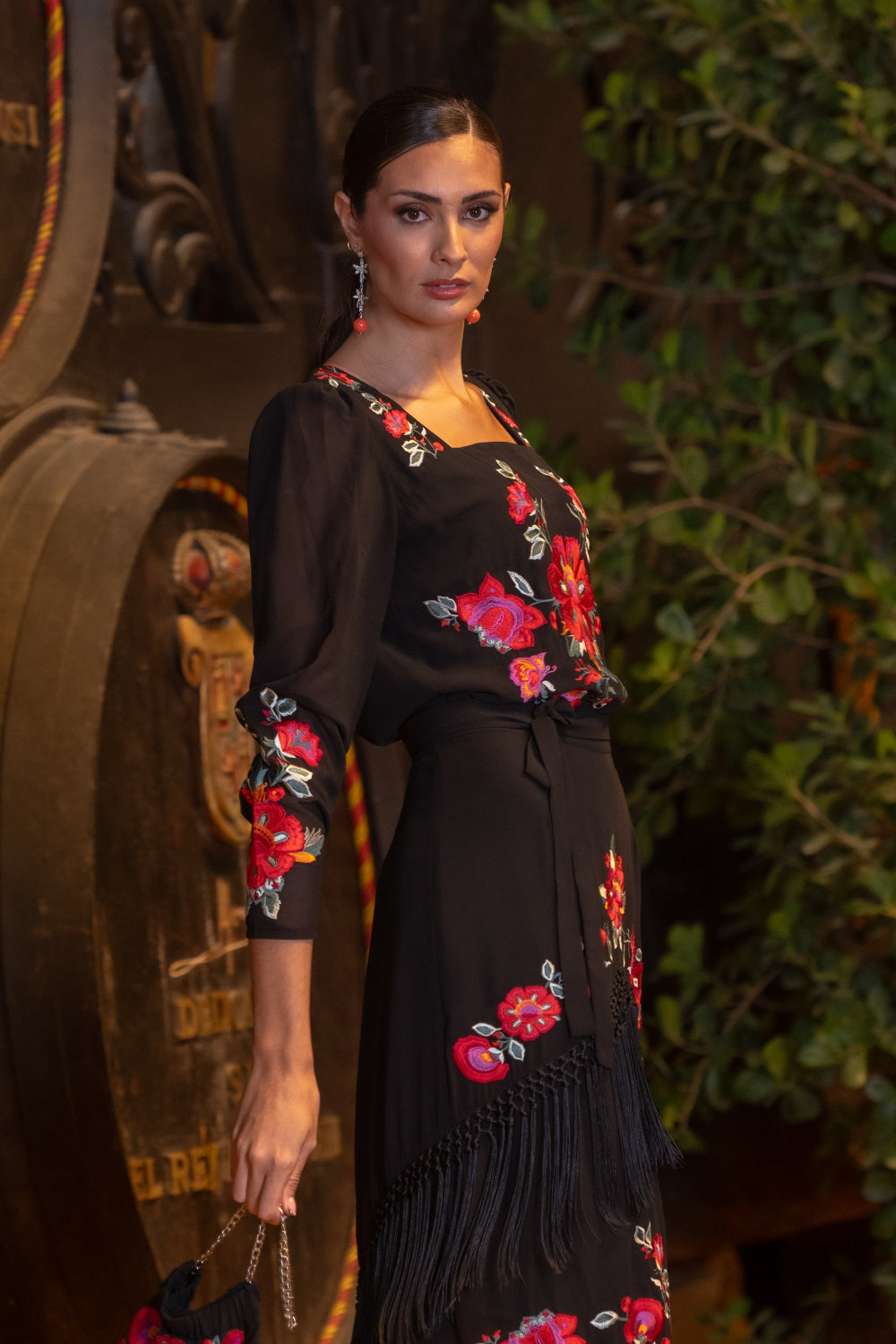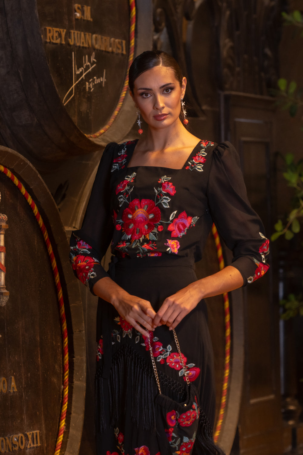 Top negro bordado flores mantón multicolor , escote semicuadrado y manga francesa.