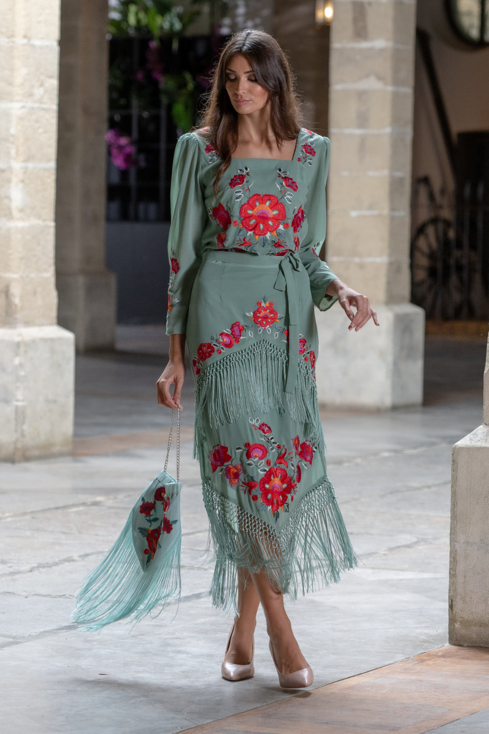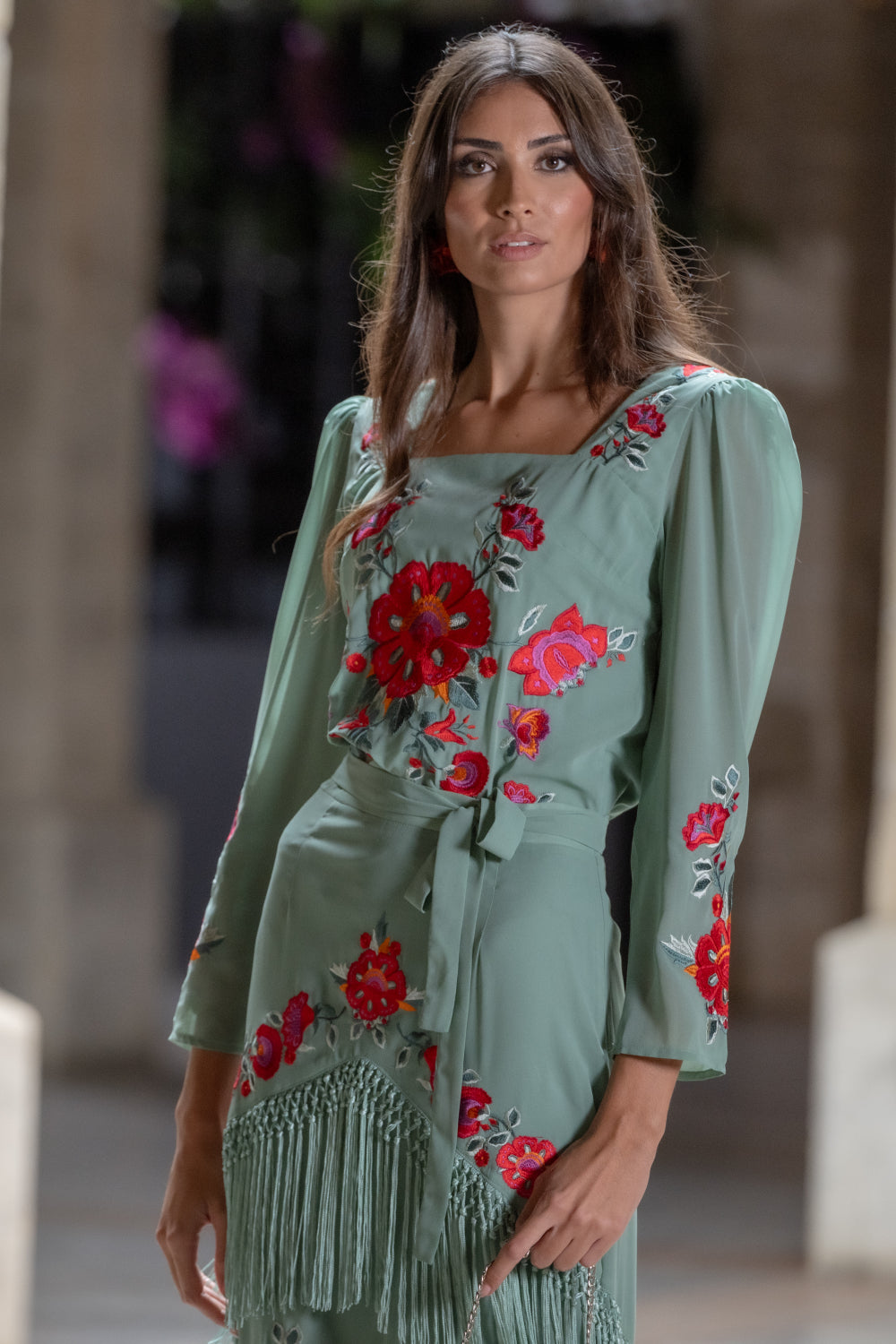 Top verde bordado flores mantón multicolor , escote semicuadrado y manga francesa.