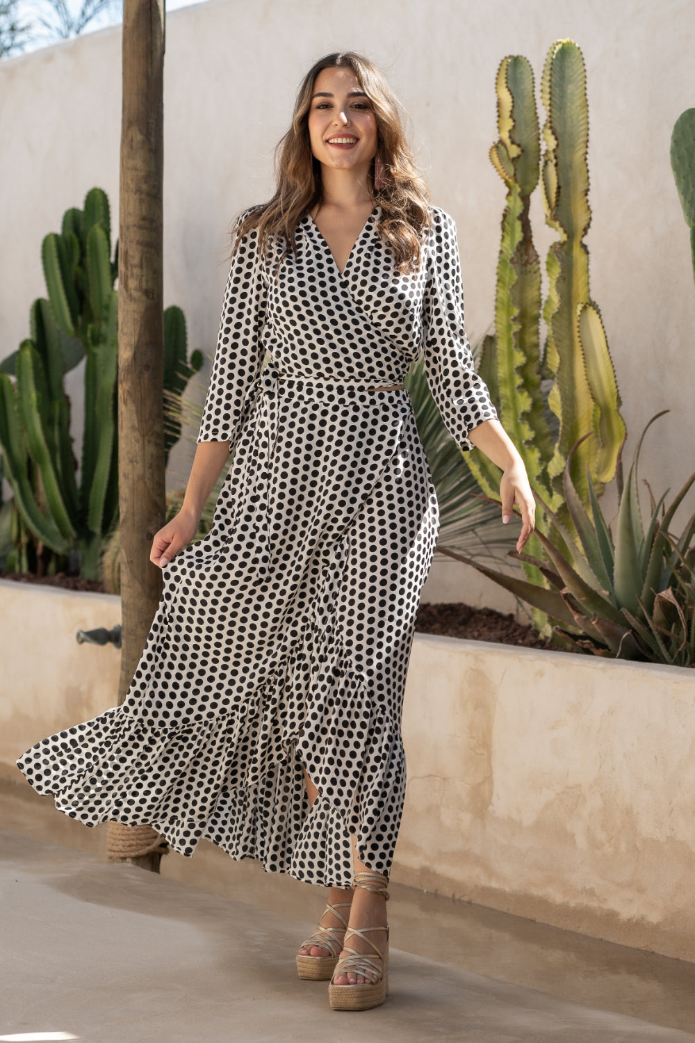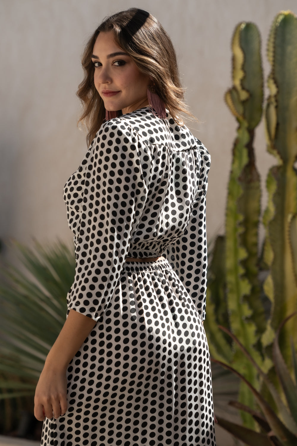 Top camisero cruzado atado con lazada y manga francesa en polisilk y con estampado de lunares negros Sunset & Moon.