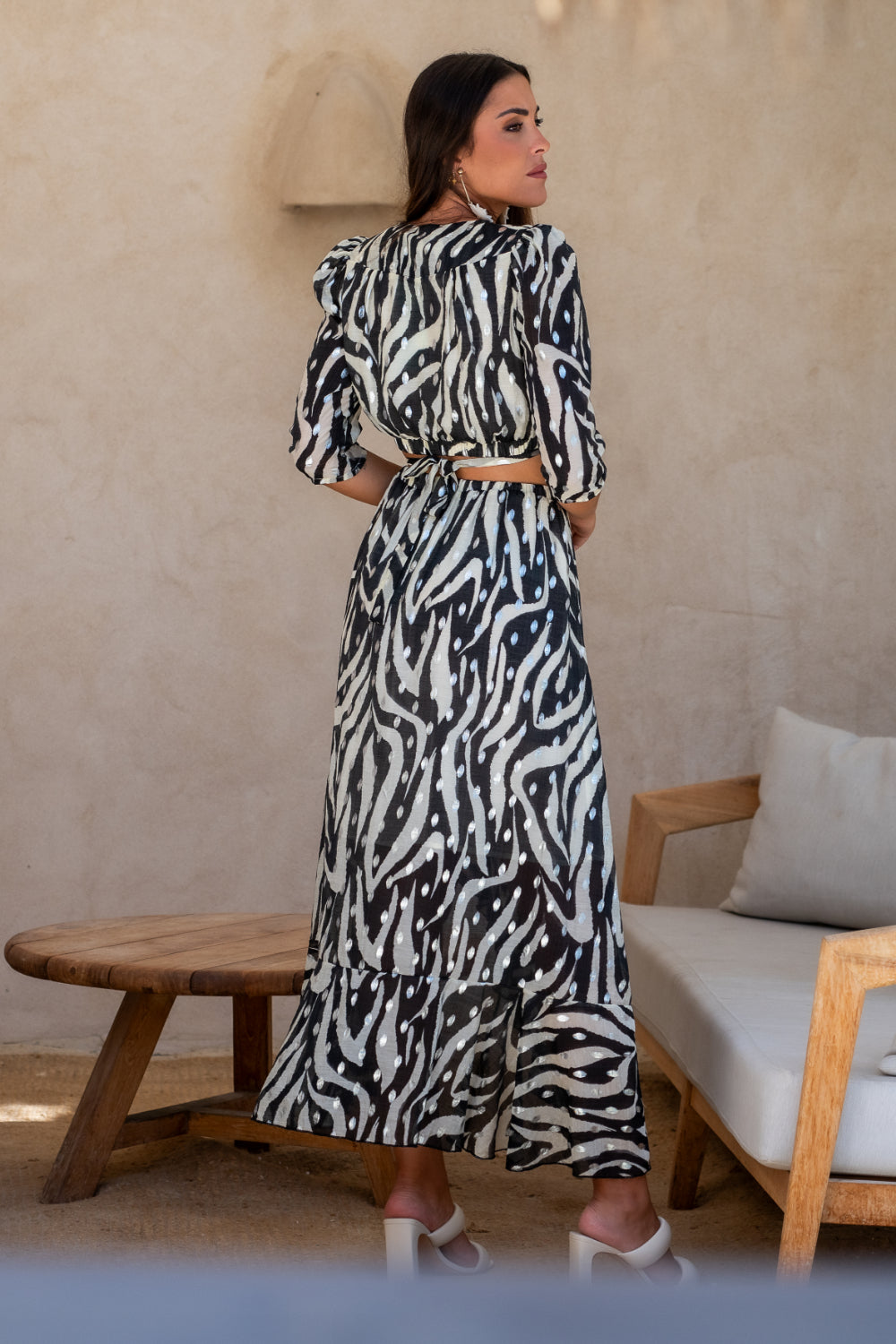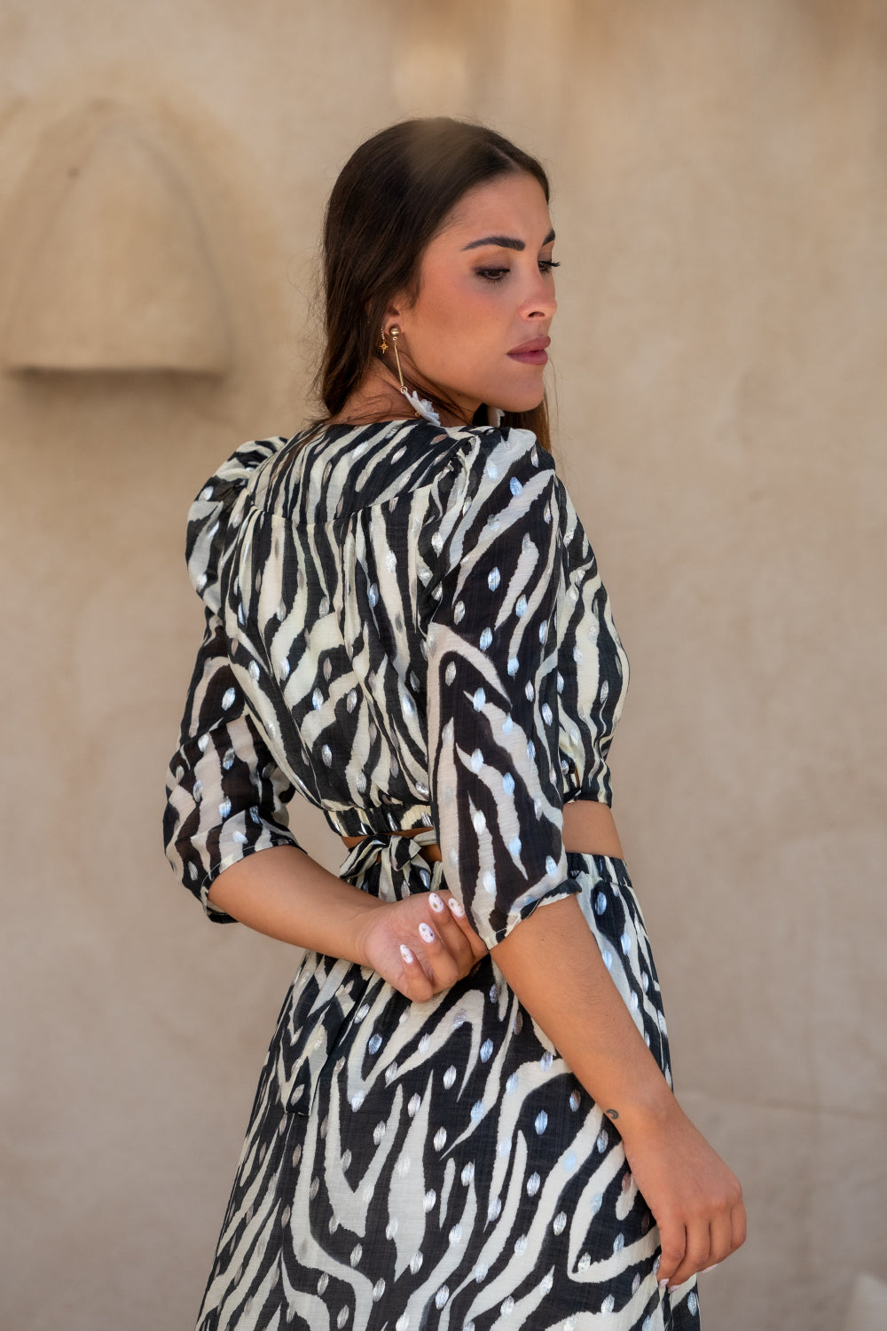 Top camisero cruzado atado con lazada y manga francesa en polisilk y con estampado animal print negro con detalles plata Sunset & Moon.