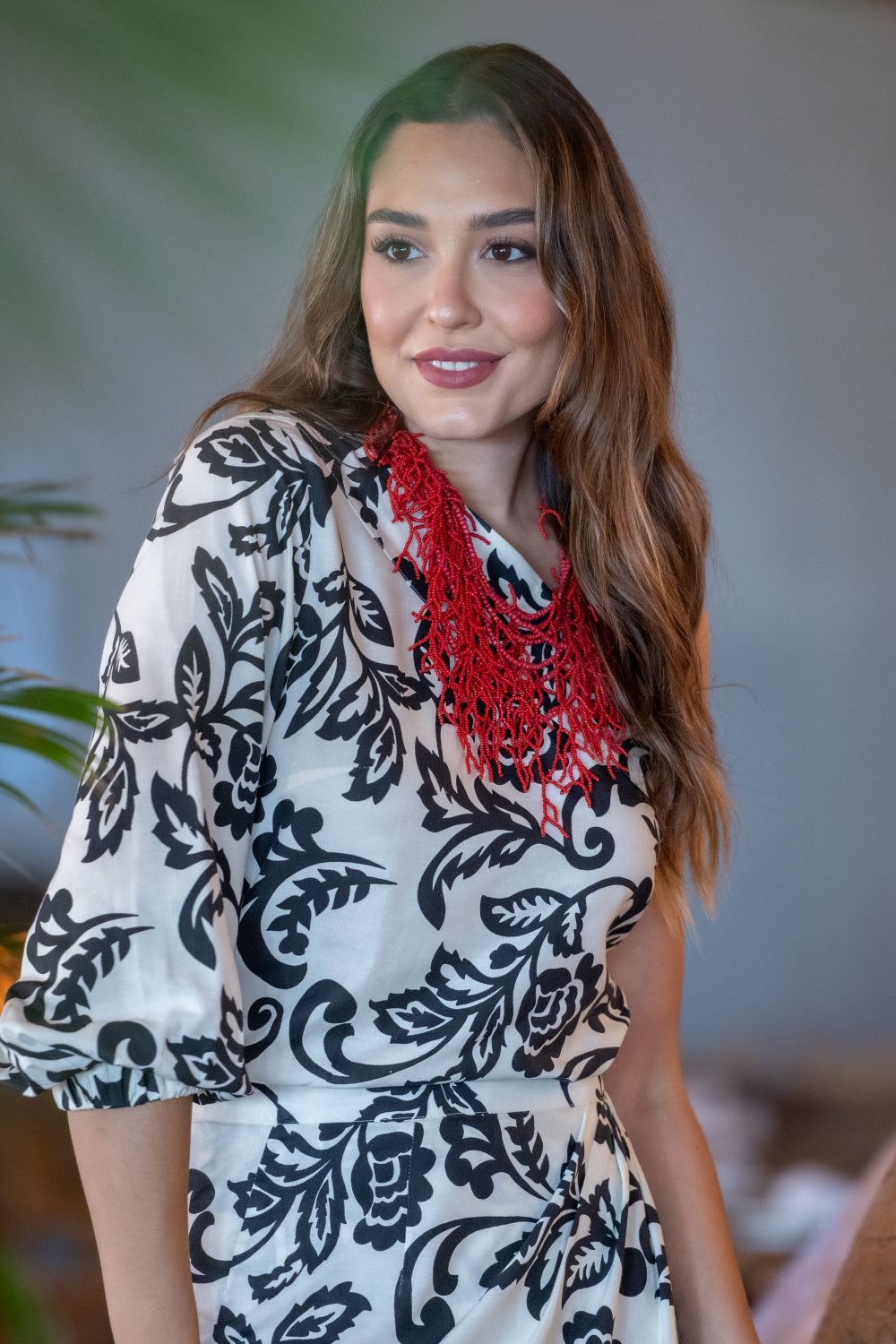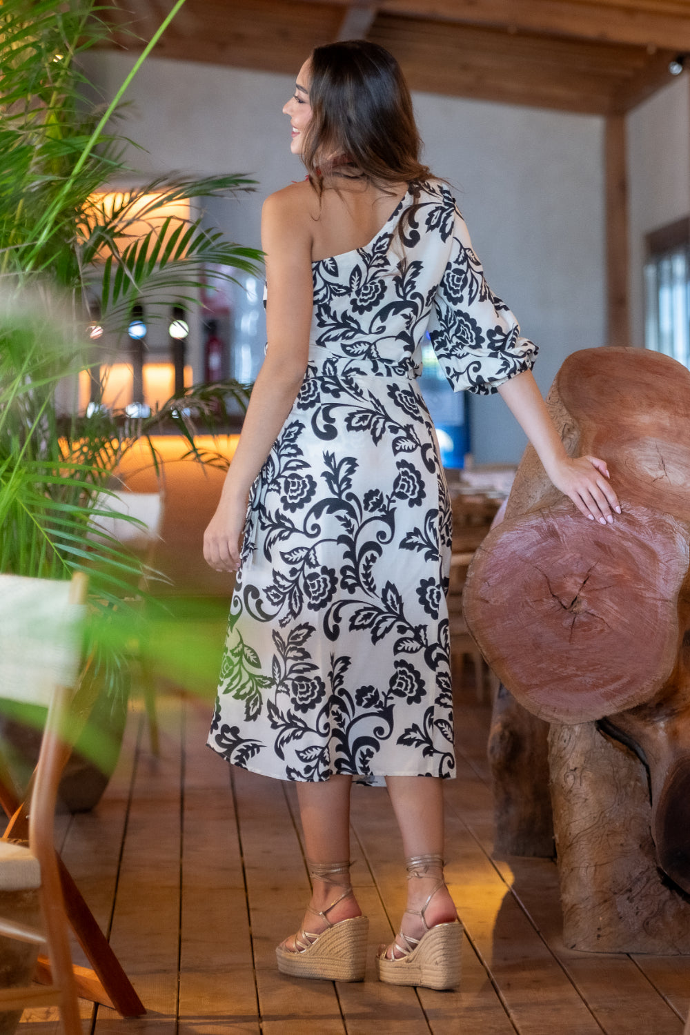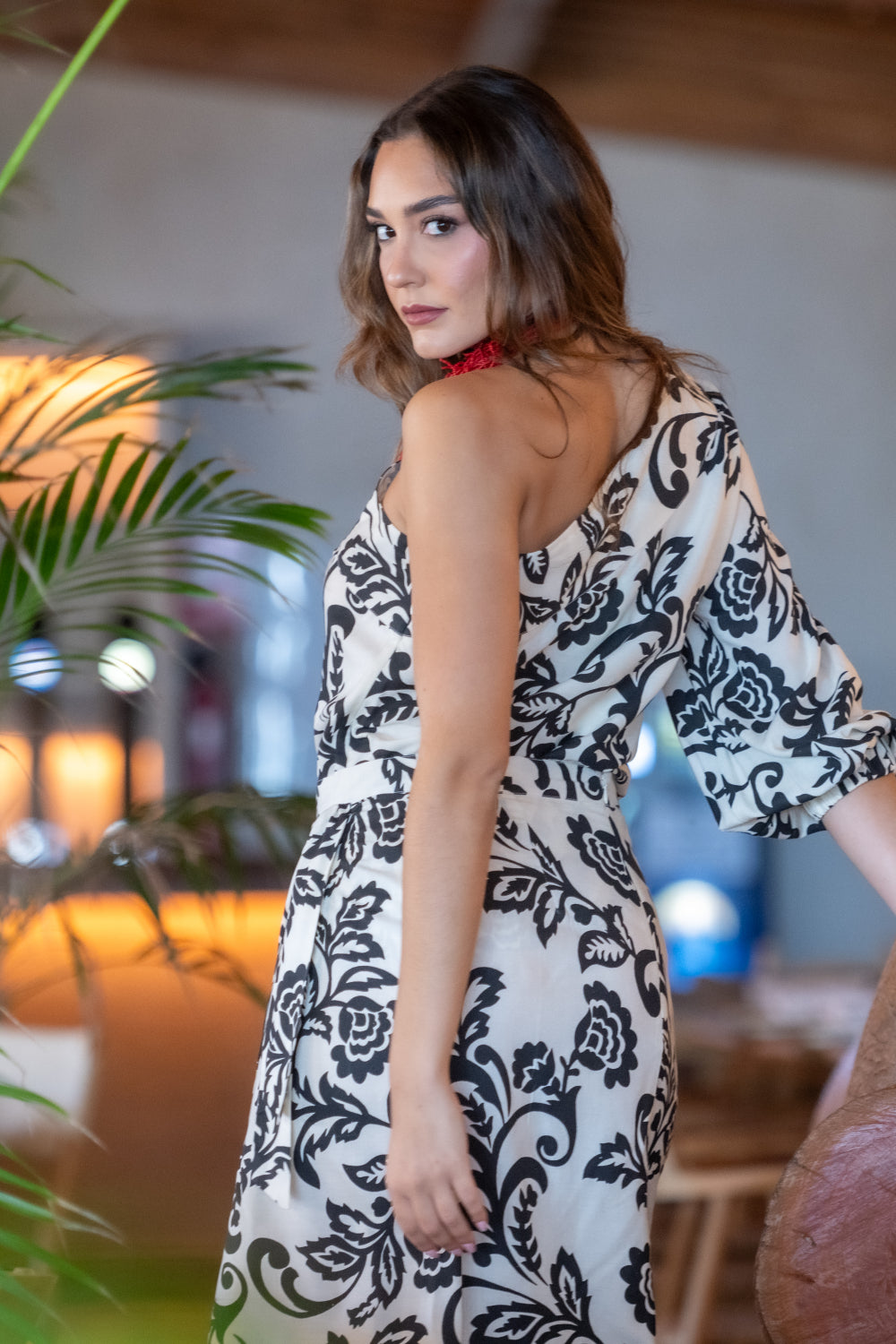 Top asimetrico con manga francesa terminada en volante en viscosa y con estampado en blanco y negro Sunset & Moon.