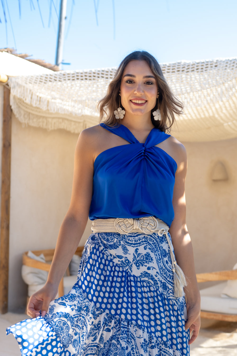 Top escote halter con tirantas a la espalda en polisilk color añil Sunset & Moon.