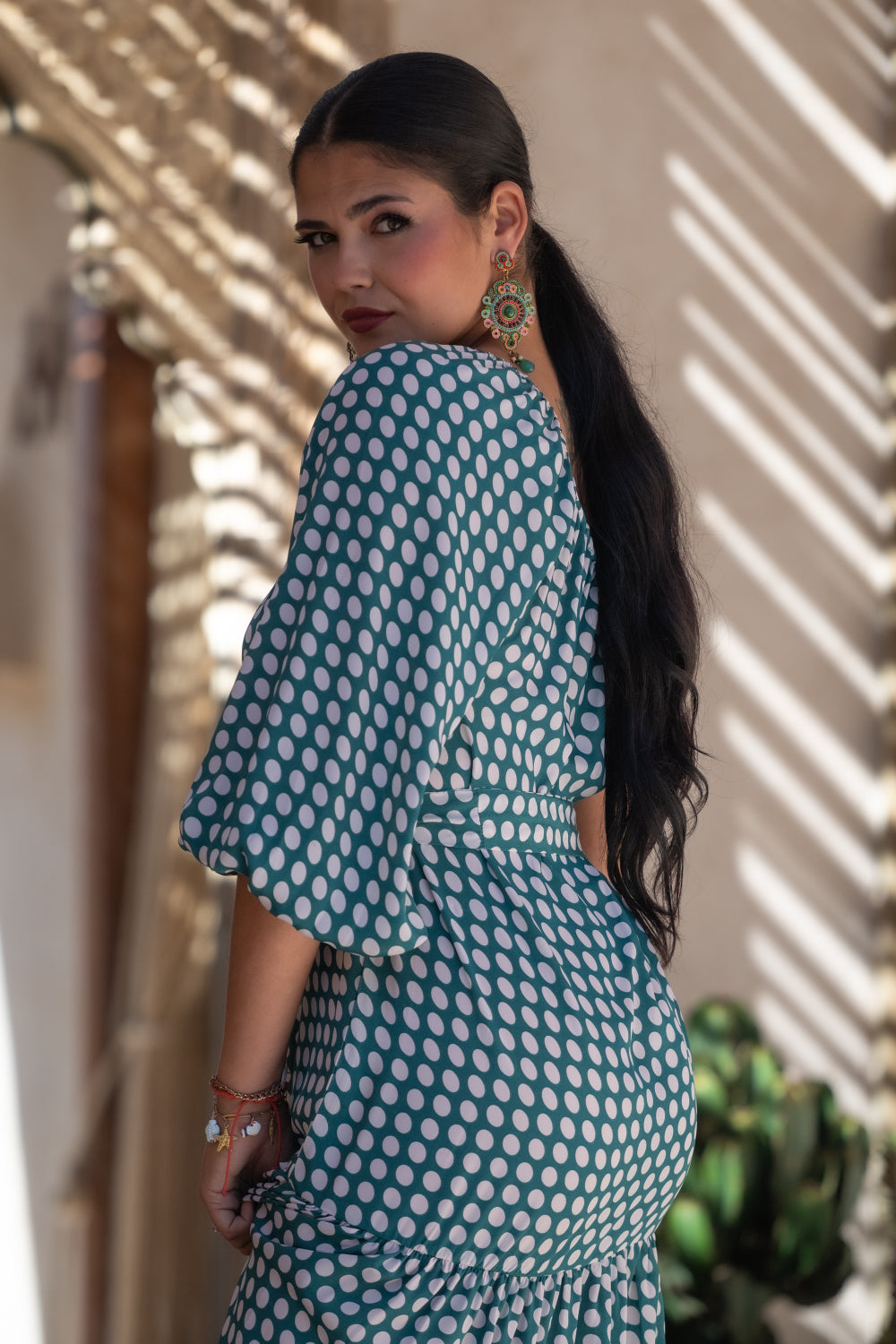 Vestido escote asimetrico y una sola manga globo. Vestido largo y cuerpo de volantes con cinturon independiente. Tejido en polisilk y estampado de lunares verde petroleo con el cinturon a juego Sunset & Moon.