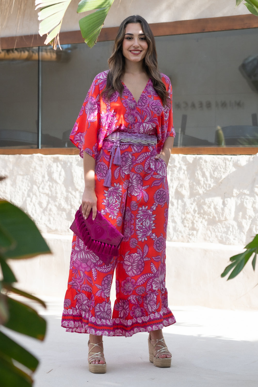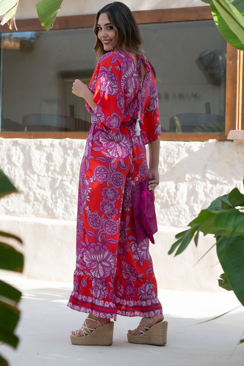 Vestido maxi cruzado y anudado en cintuta con volante en el bajo que sube hacia el cruce y manga campana acabada en volante de capa. Tejido en polisilk y estampado organico en tonos coral y morado Sunset & Moon.