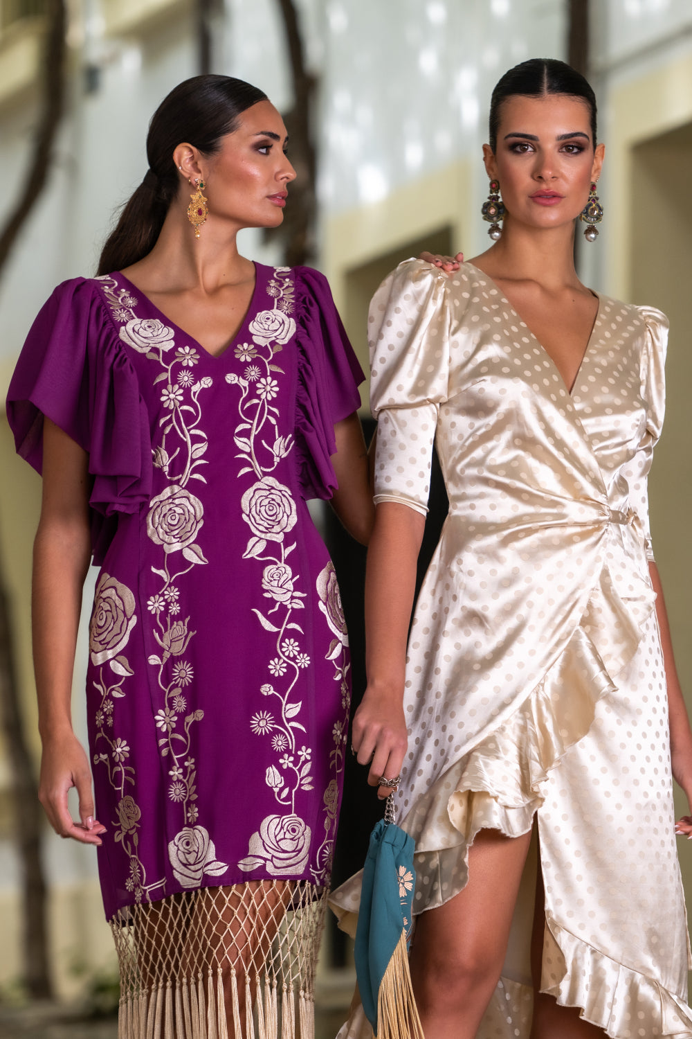 Vestido cream beige de satén liso con lunares al tono, cruzado con volante y media manga