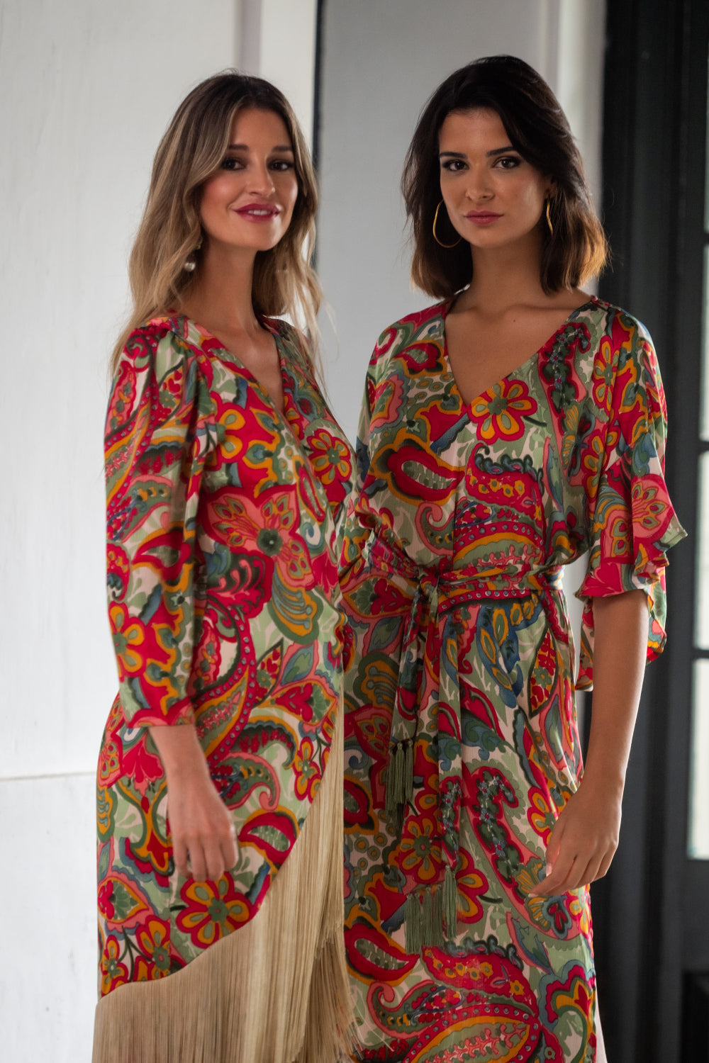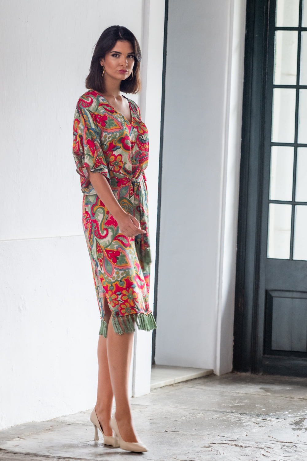 Vestido salseo tapiz en gasa estampada de cachemira en tonos fucsia y coral y verde con manga japo terminada en volante y rematado en el bajo y en el fajín con flecos verdes