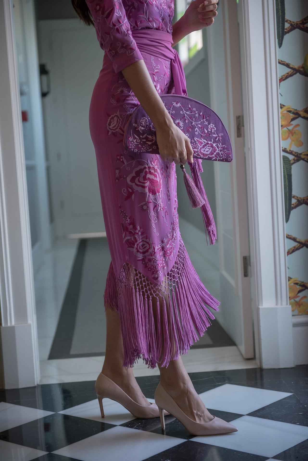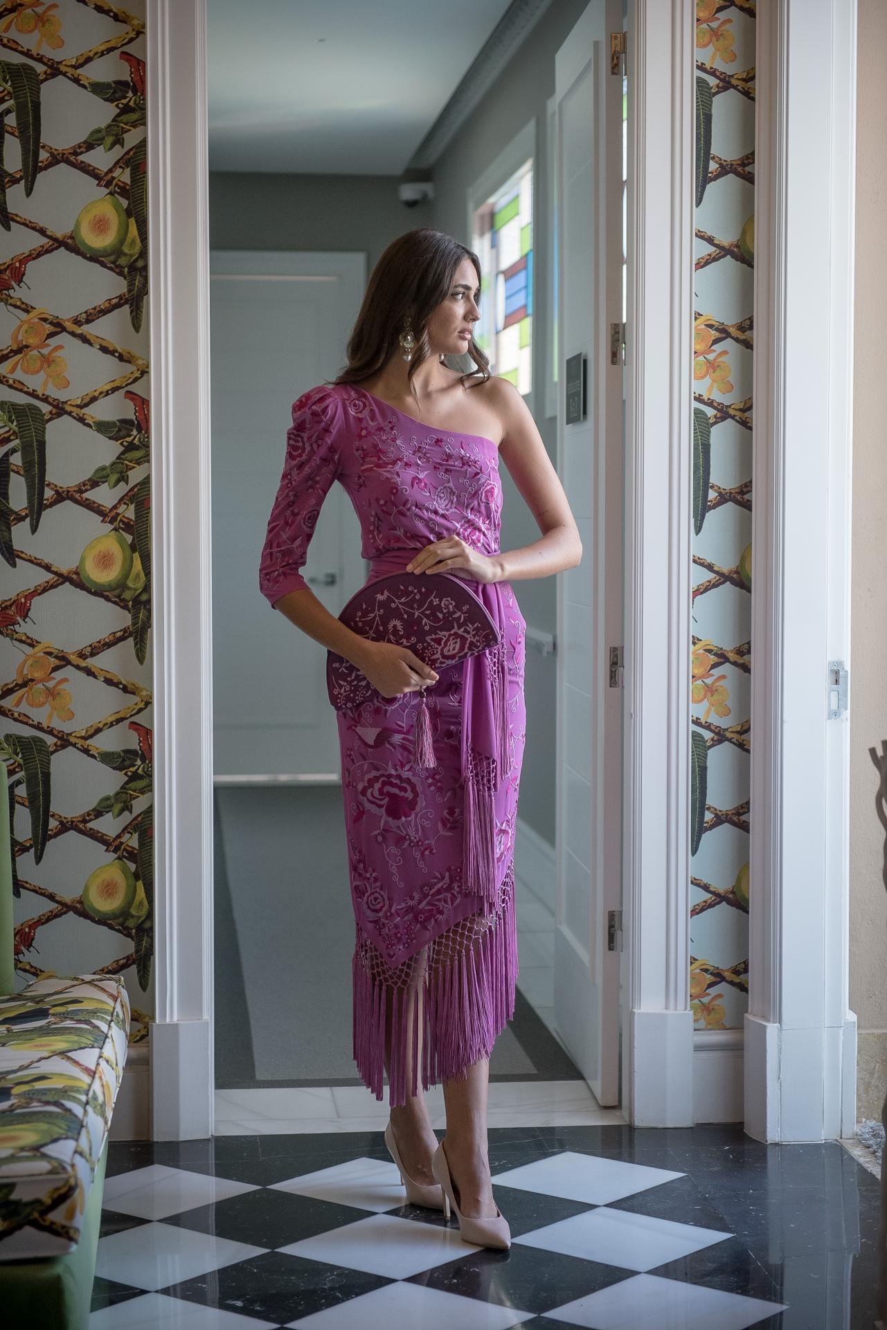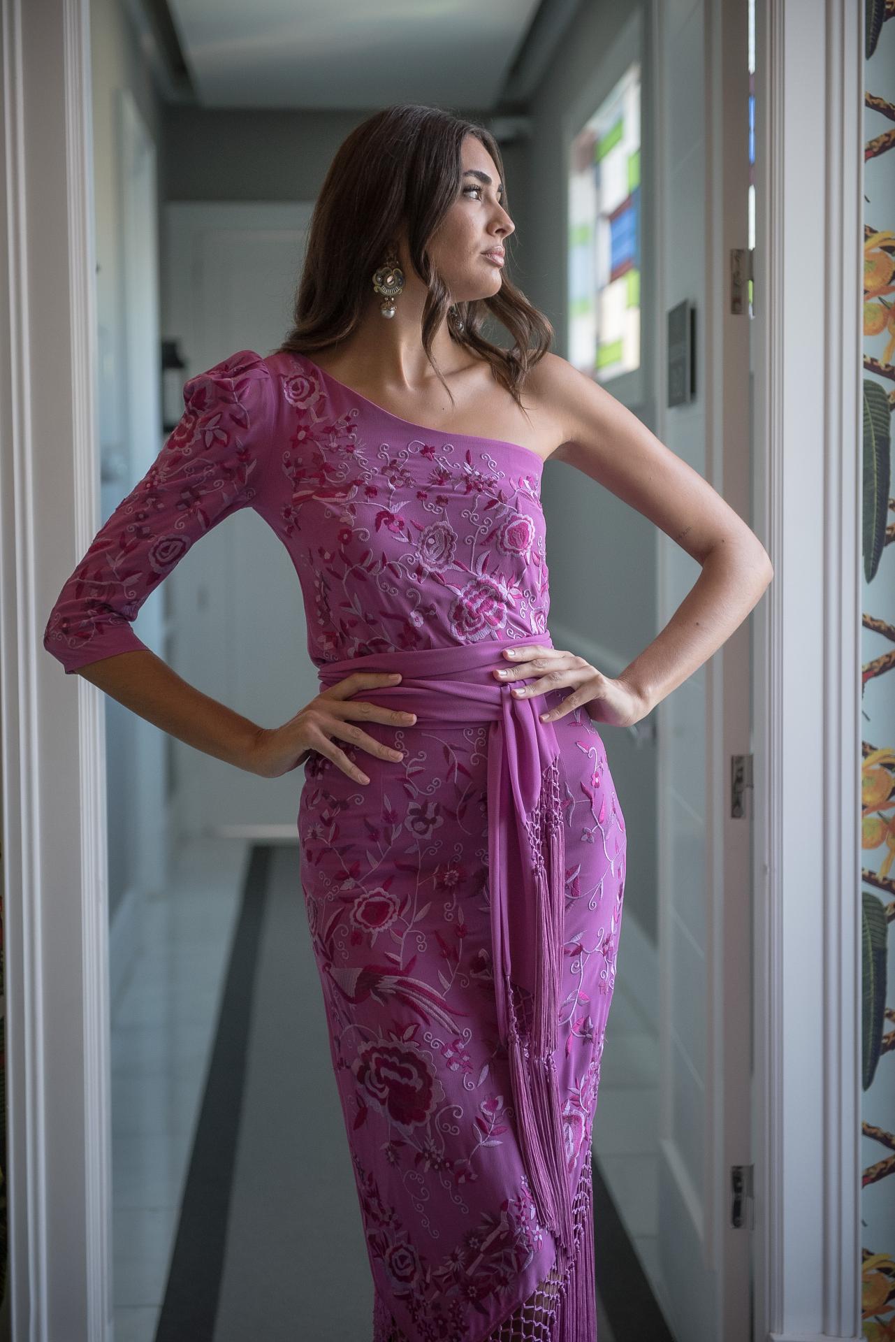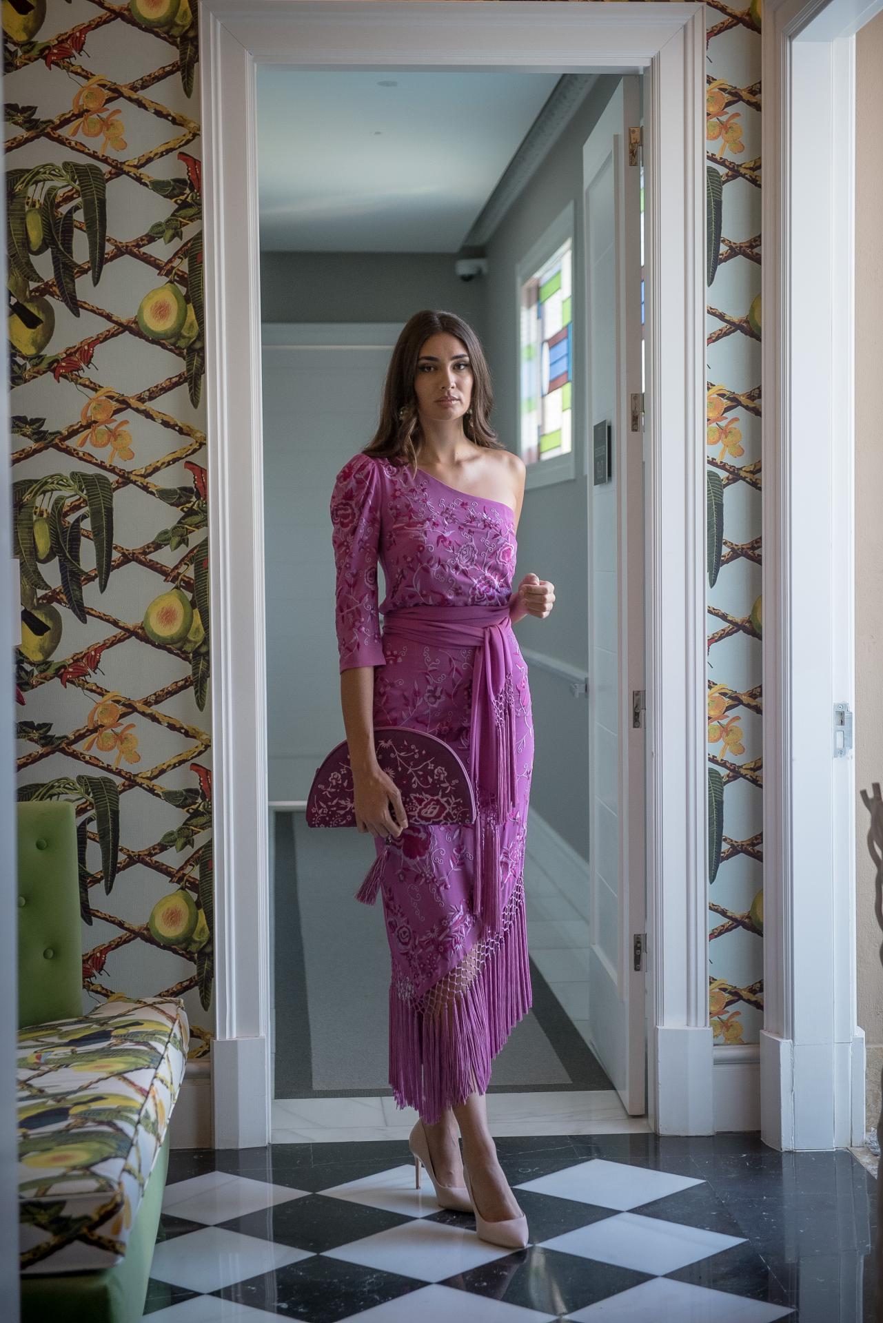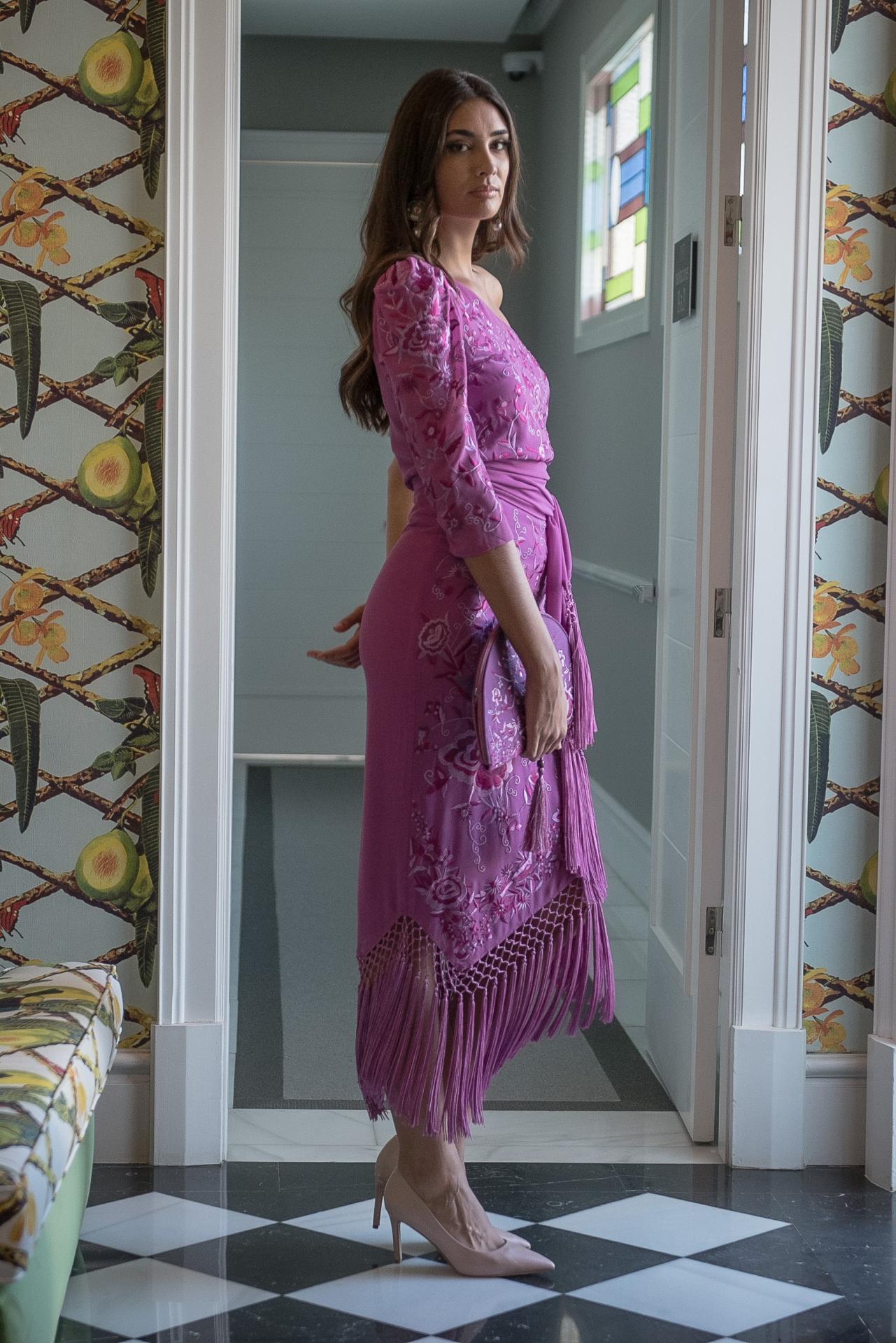 Falda de gasa lila bordada al tono como un mantón de manila terminando en forma asimétrica con flecos