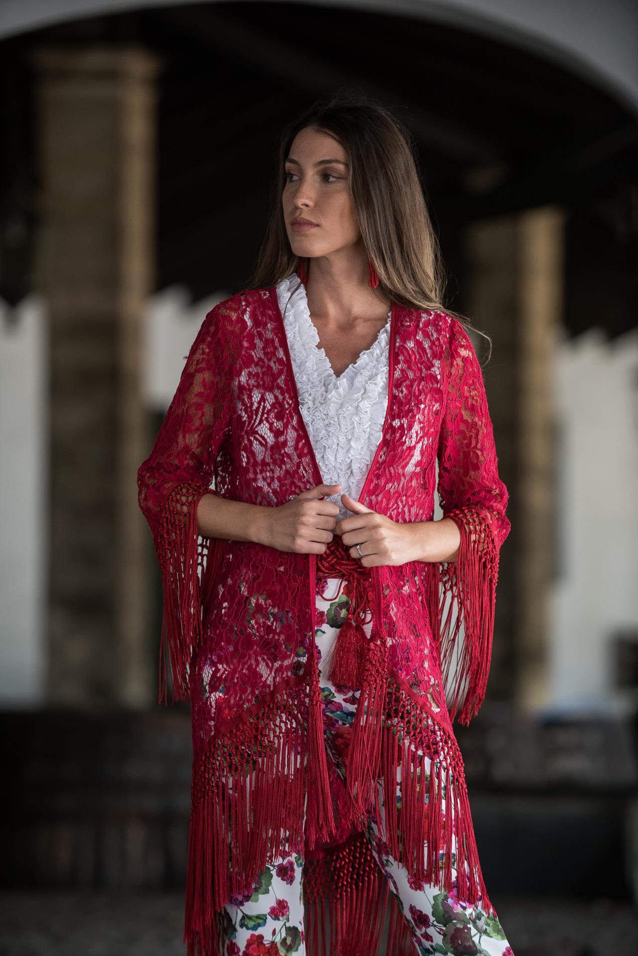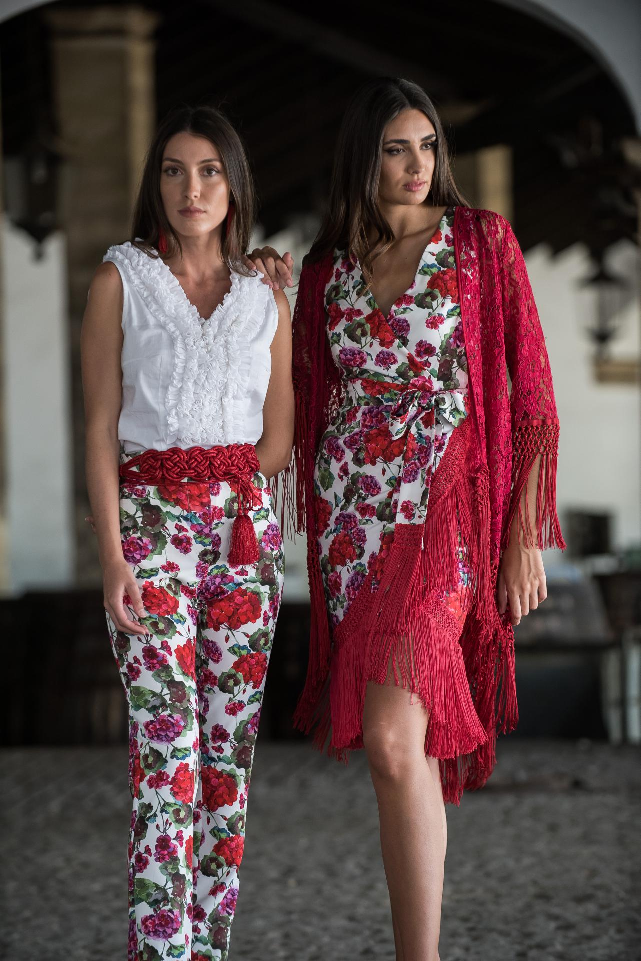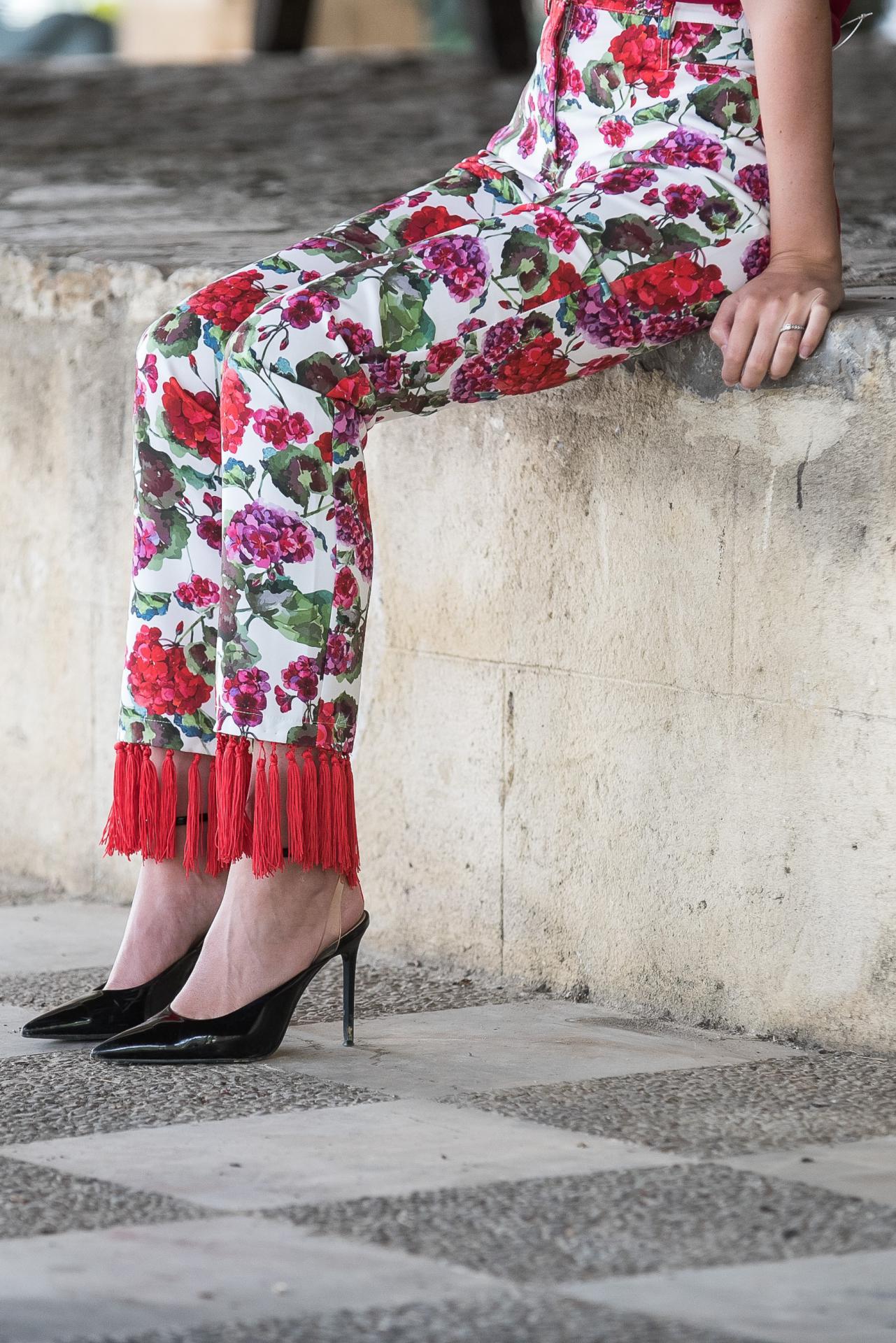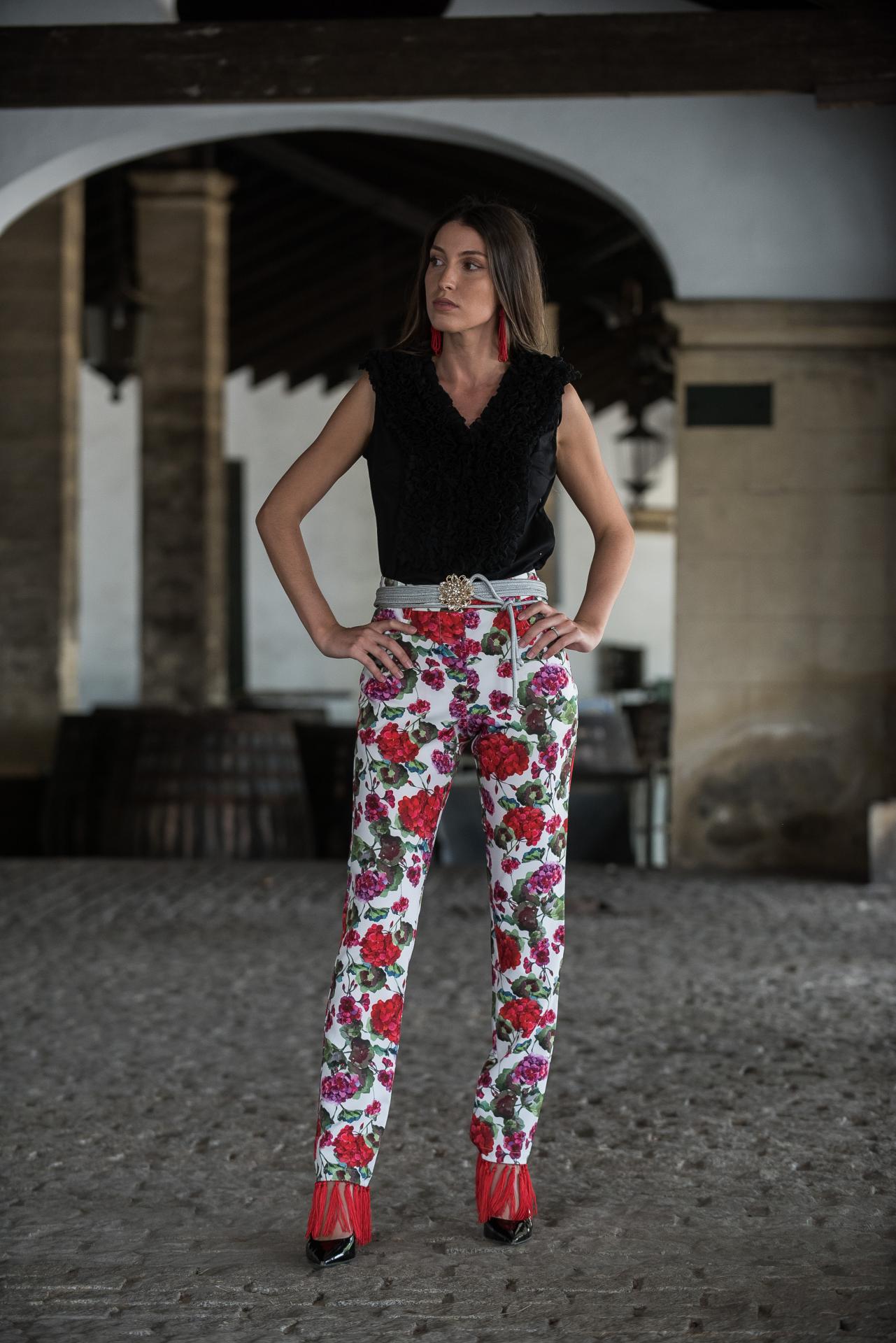 Pantalón corte clásico con flecos rojos en el bajo en estampado blanco con geranios rojos