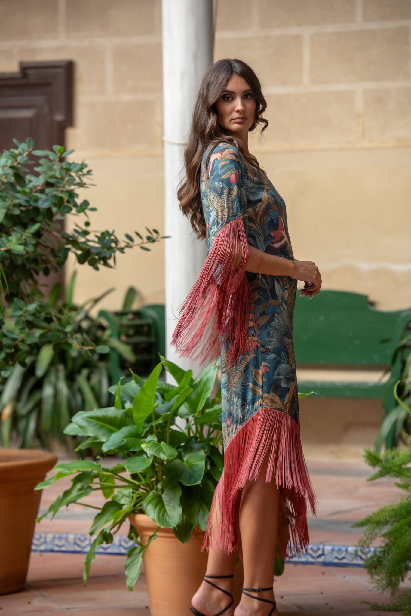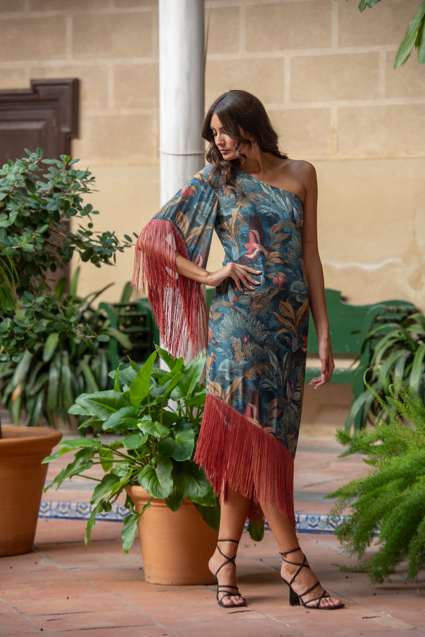 Vestido magalí gasa corto asimétrico con flecos coral de estampado botánico verde junco con pájaro coral.