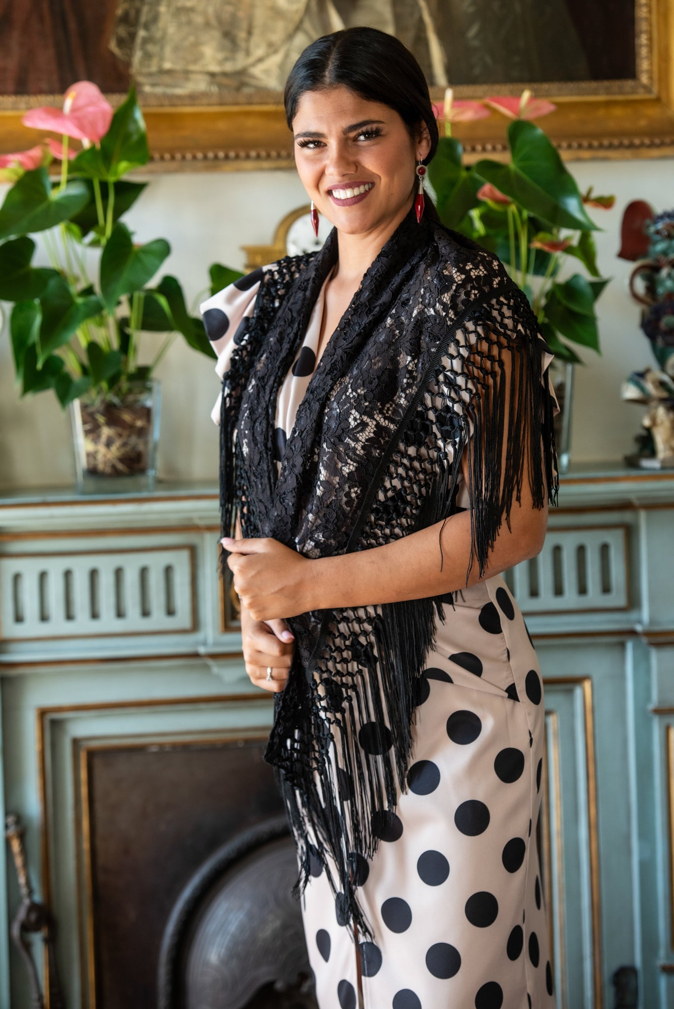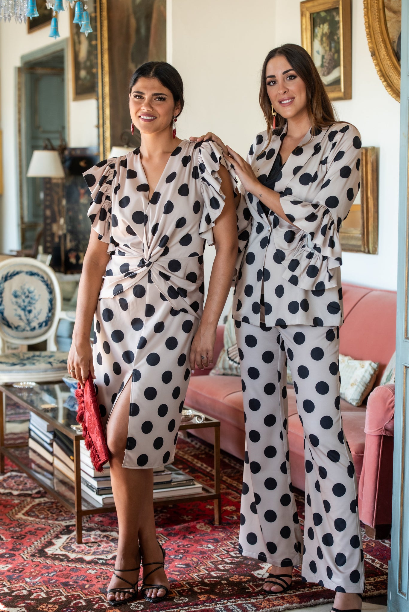 Vestido lola lunares de satén con fondo crudo estampado con lunares negros sin mangas con volante de capa a la sisa . Escote de pico y nudo a la cintura. largo hasta la rodilla con abertura central.